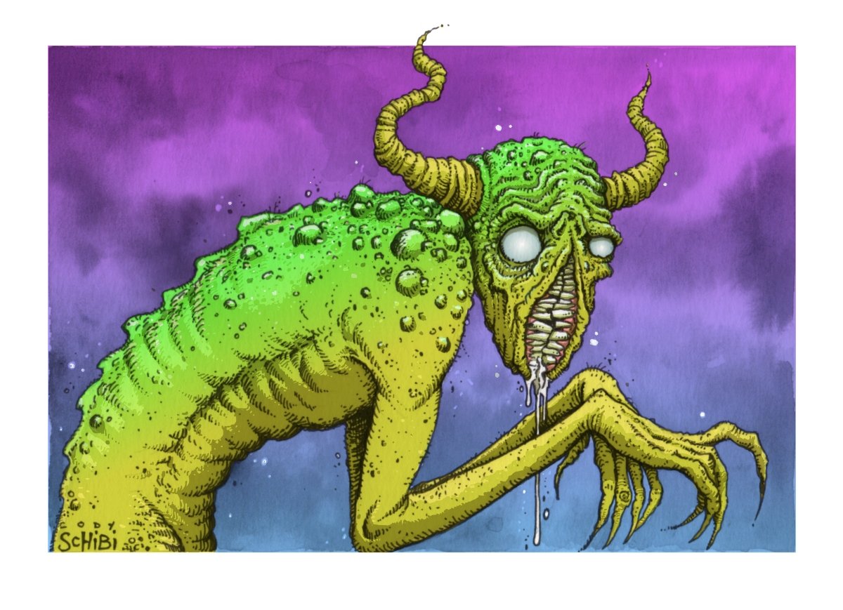 Cody Schibi: I would absolutely say so! As I mentioned, I consumed Fangoria magazine as a kid and I truly wanted to be a special FX artist for a while. Studying effects and masks and how FX wizards created their masterpieces definitely inspired (and continues to inspire) my own art. Illustration-wise, I was always obsessed with the super detailed artists whom I’d study & could stare at for hours. Artists like Bernie Wrightson, R. Crumb, Moebius, Geof Darrow, Frank Quitely, Aaron Horkey, and Alex Pardee - they are ALL masters of linework and influenced my style. Their work is so organic and alive, and I try to give all my art that sense of movement and personality to them as well. I’m in love with SO MANY different artists that aren’t big into detail, even abstract artists that influenced me greatly, but those are definitely not as obvious in my work.