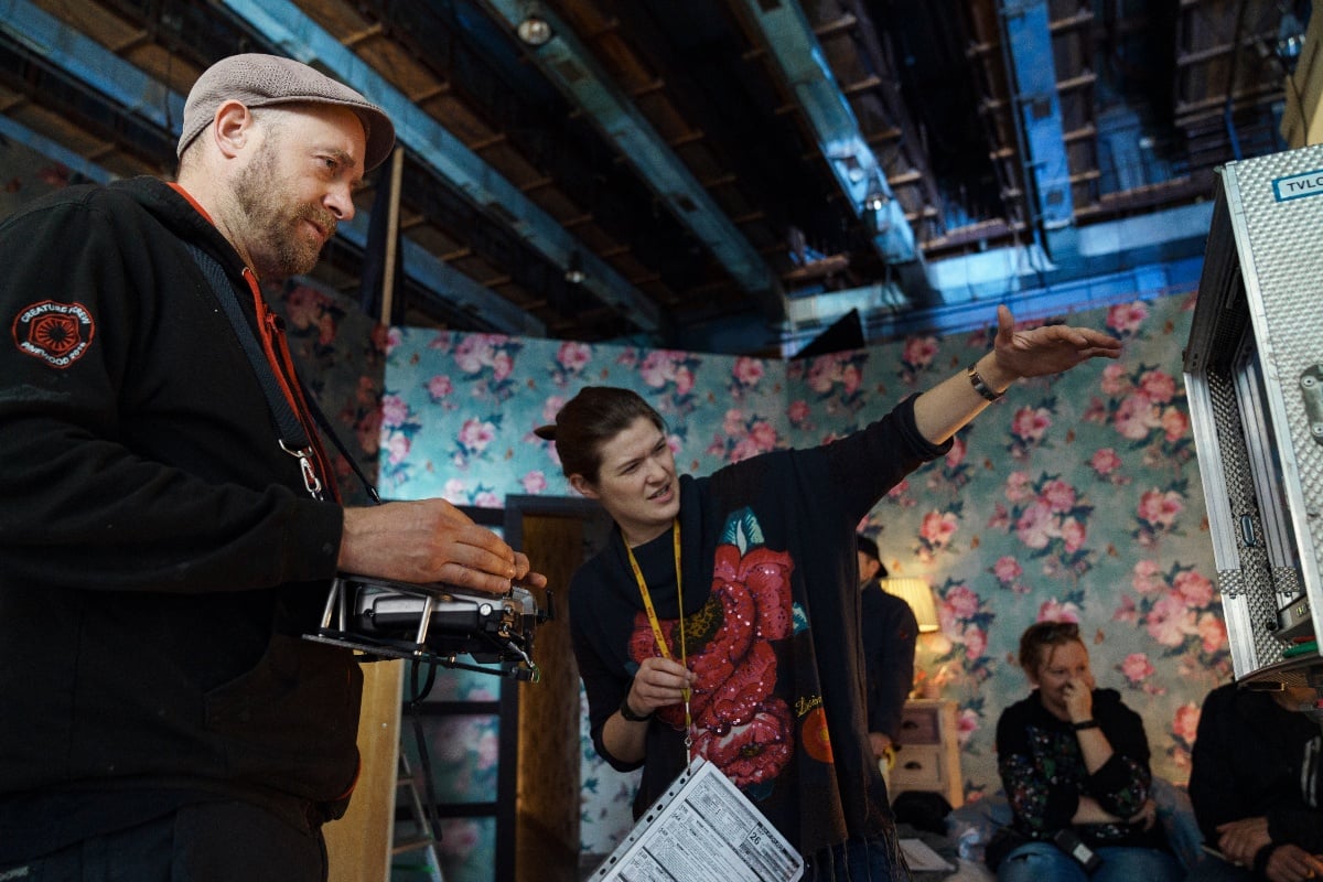 Creature effects supervisor and animatronic designer Gustav Hoegen and director Hanna Bergholm planning a shot. AD Laura Melke sitting in the background.