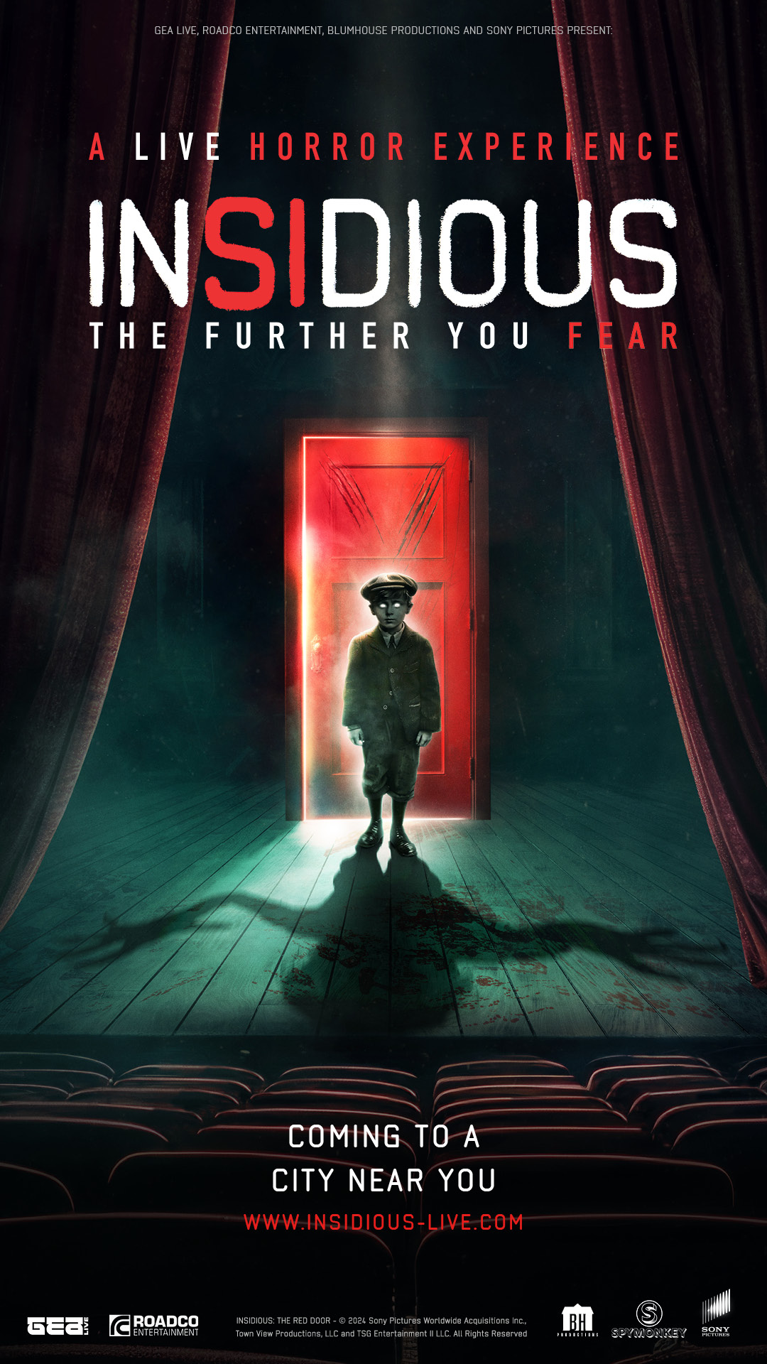 From the Press Release: "Brace yourself for the scare of a lifetime, as the world of Insidious jumps off the screen and directly into your theater seat with “INSIDIOUS: THE FURTHER YOU FEAR” – a live immersive horror experience that will bring your darkest fears to life right before your eyes, based on the box office hit horror film franchise from Blumhouse, director James Wan, and writer Leigh Whannell. GEA Live, Blumhouse, Sony Pictures Entertainment, and RoadCo Entertainment have joined forces to unveil a spine-tingling, live immersive show that will haunt 80+ seated theaters across North America starting in January 2025. Tickets go on sale October 25. For more information including tour dates, visit www.insidious-live.com.