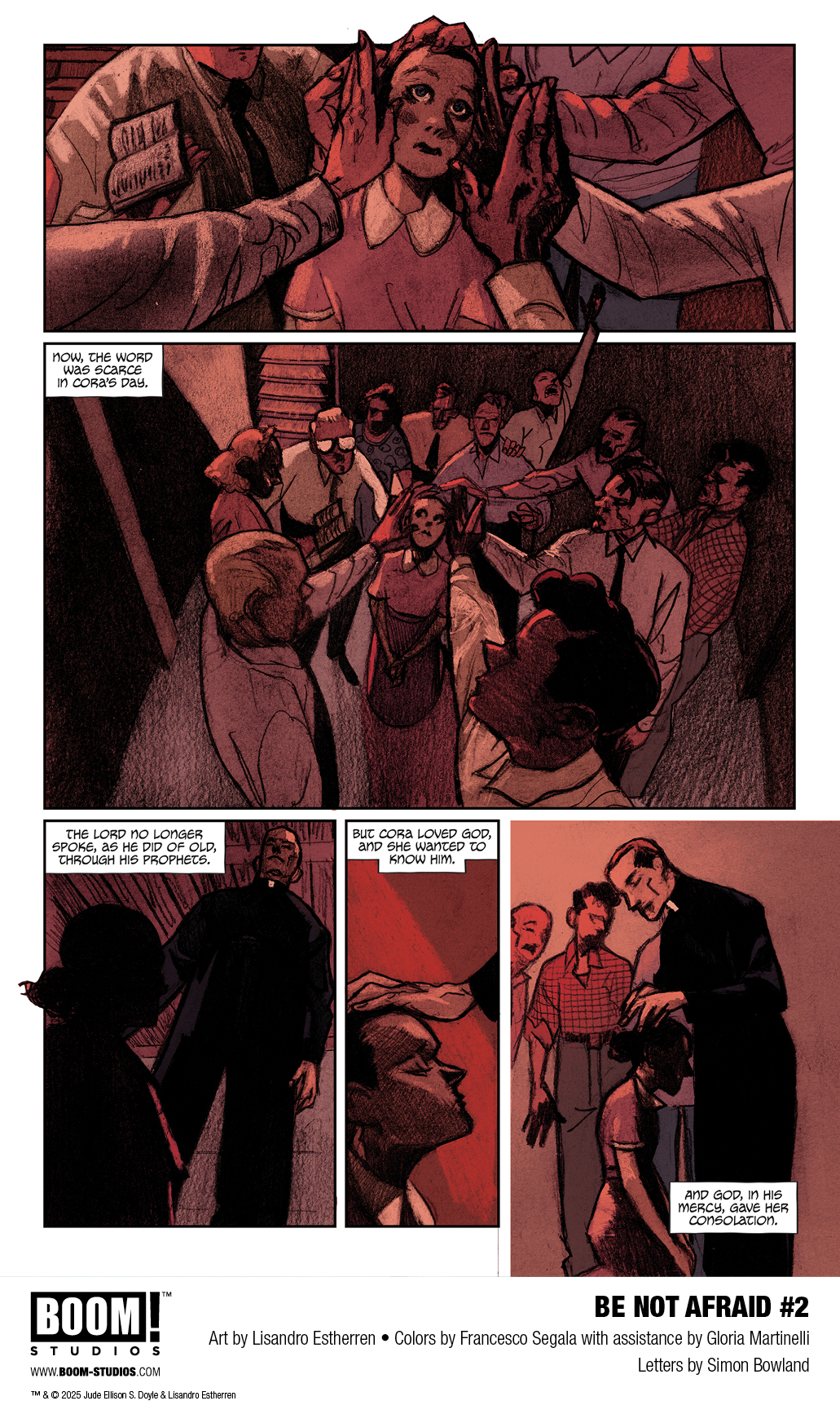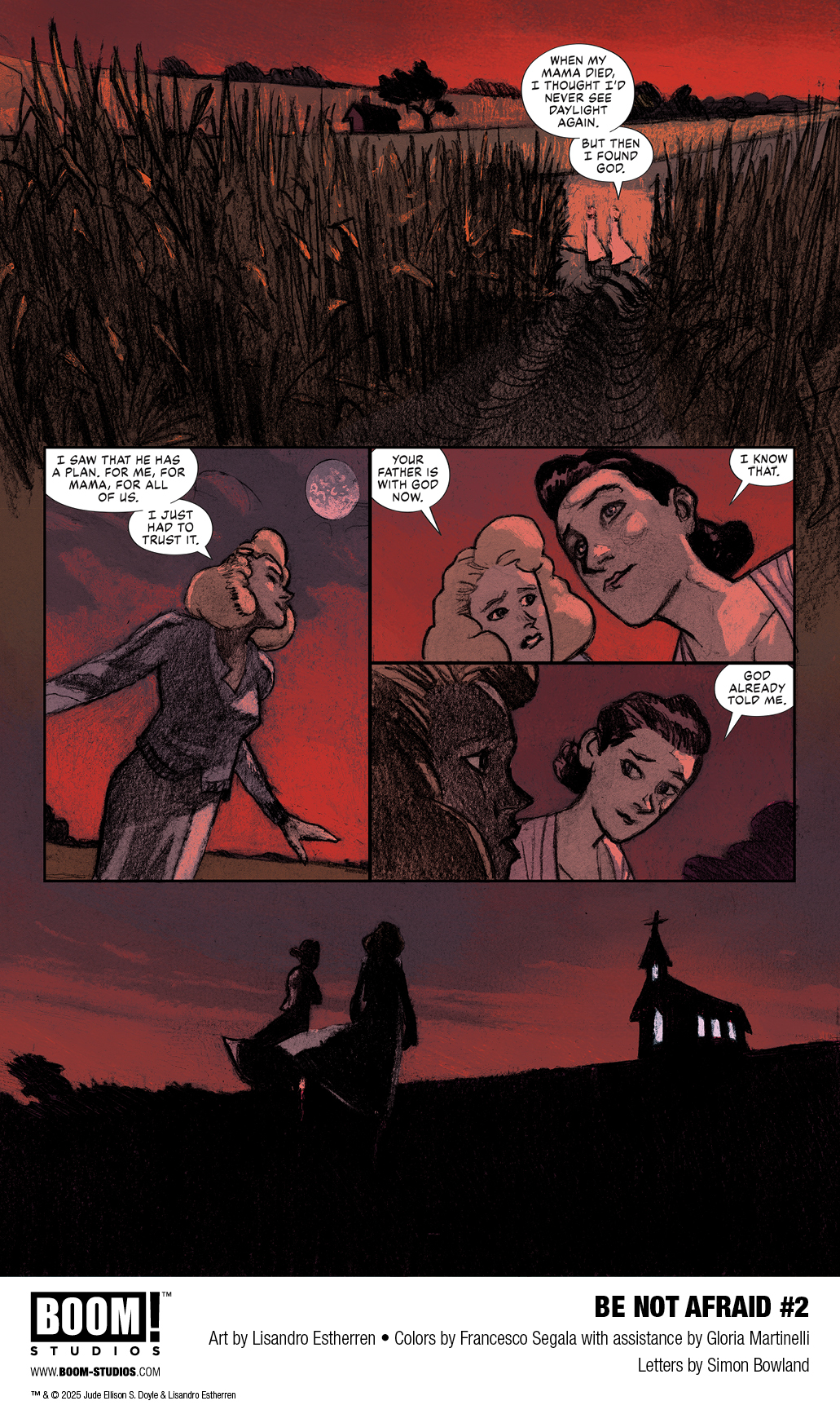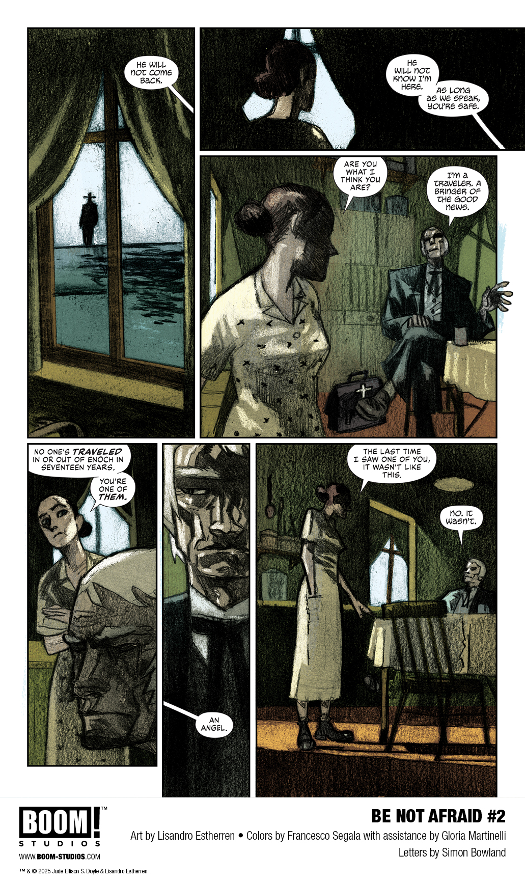 In conjunction with BOOM! Studios, we are thrilled to provide Daily Dead readers with a first look at BE NOT AFRAID #2, the "breathtaking" continuation of the new original series from Jude Ellison S. Doyle (Hello Darkness, Maw), artist Lisandro Estherren (Redneck), colorist Francesco Segala with assistance by Gloria Martin, and letterer Simon Bowland.
