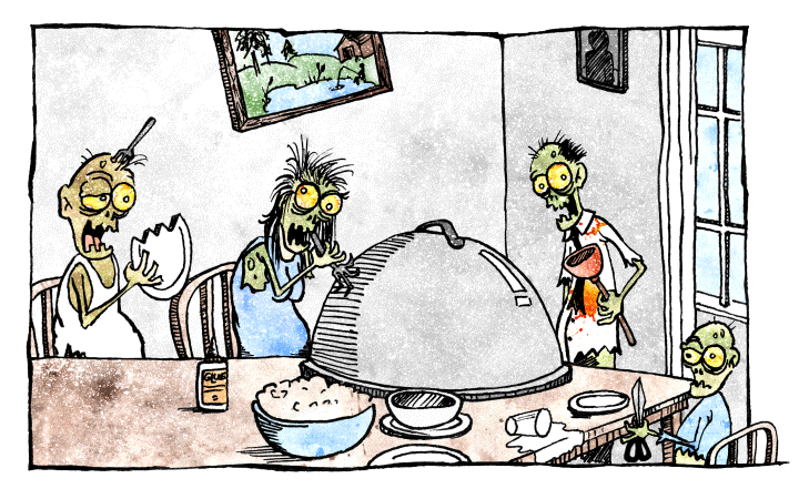 Longtime Daily Dead readers may remember that over the course of several years, artist Jeff Fuller showcased the undying humor of everyday horrors in a zombie apocalypse in his morbidly funny comic strip Zomics. We gave you the first taste of new Zomics during our Comic-Con@Home coverage and recently for Halloween. Now, Jeff Fuller is back to celebrate Thanksgiving with a brand-new living dead dinner!