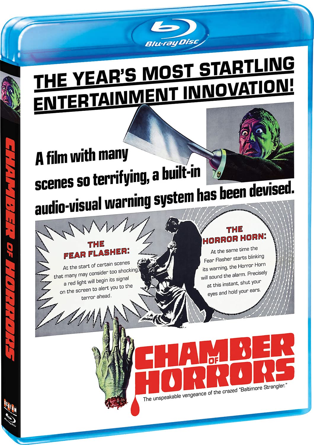 Employing not one, but two infamous gimmicks—"The Fear Flasher" and "The Horror Horn" —to warn audiences in advance of its most shocking moments, Chamber Of Horrors is a Grand Guignol cult favorite that's every bit as twisted as its villain's tortured soul!