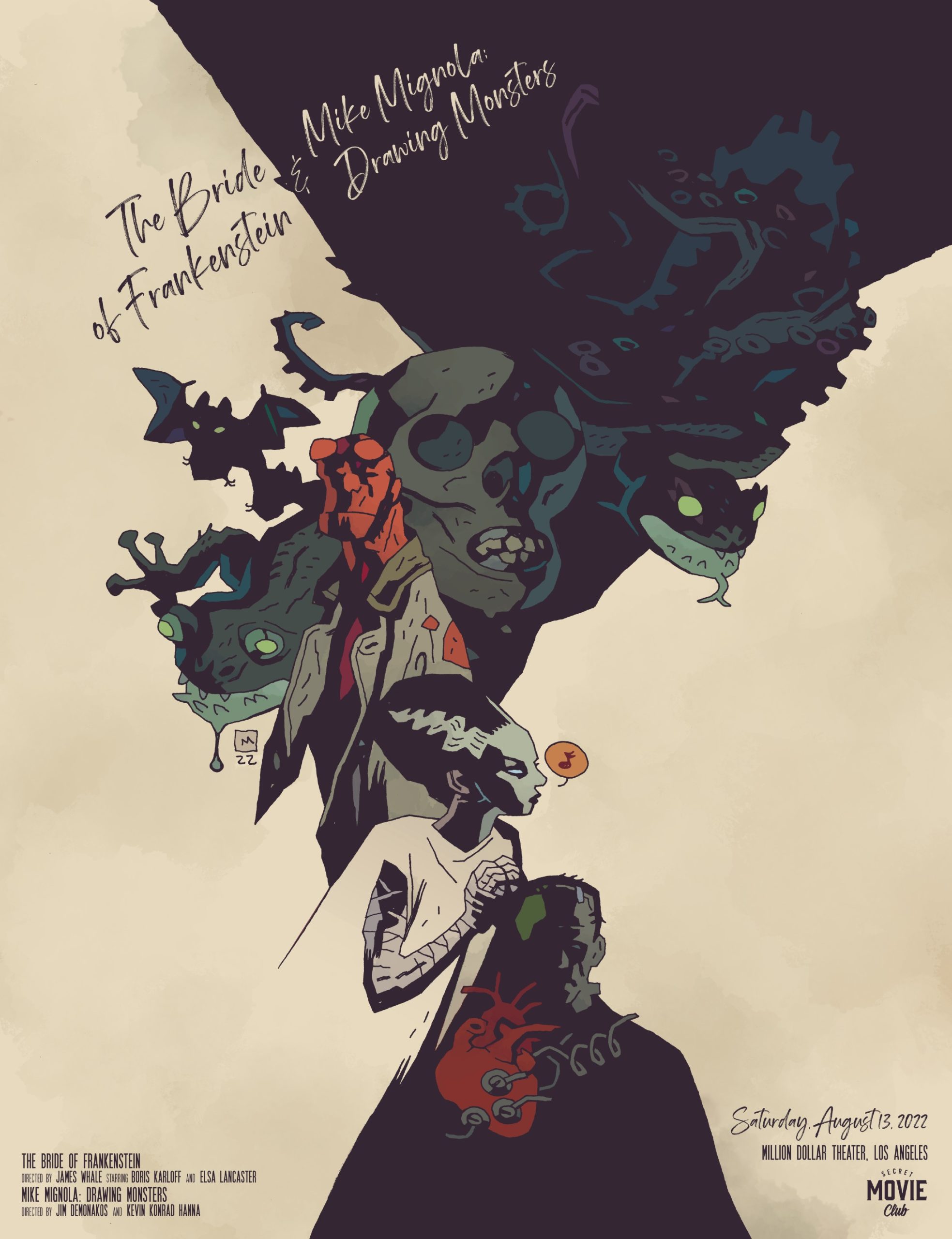 Los Angeles-based Secret Movie Club will present the first public screening of the highly anticipated Mike Mignola: Drawing Monsters documentary at LA’s iconic Million Dollar Theater on Saturday, August 13, 2022. The screening will include a live onstage interview with Mike Mignola, the legendary creator of Hellboy, alongside documentary filmmakers Jim Demonakos and Kevin Konrad Hanna, and Secret Movie Club founder Craig Hammill. The evening will begin with a special 35mm archive print screening of Universal Studios’ iconic Bride of Frankenstein, the James Whale-directed film which has inspired Mignola’s storytelling for decades. Attendees will be able to purchase a limited-edition 18” x 24” Secret Movie Club poster featuring Hellboy, the Frankenstein monster, and the monster’s bride, by Mignola and award-winning colorist Dave Stewart. The Mike Mignola: Drawing Monsters event will begin at 6:00 PM. Advance ticket and poster sales are available now.