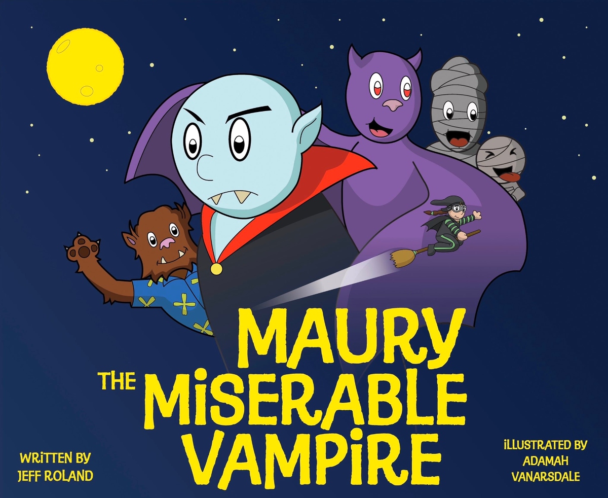 Written by Jeff Roland and illustrated by Adamah Vanarsdale, Maury the Miserable Vampire is now available from Spooky Ink in paperback, hardcover, and eBook! This new edition includes freshly designed text pages and a hidden puzzle throughout the book featuring Barry the Bat!