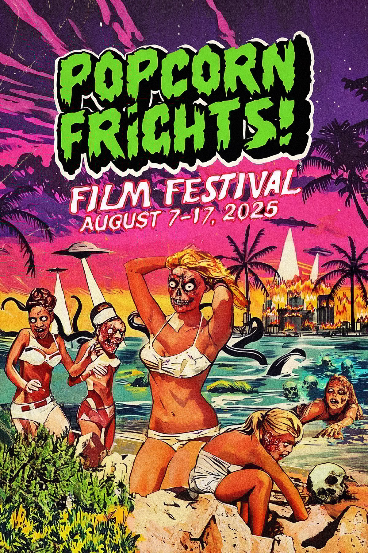 Below, we have a look at the official press release with additional details as well as this year's festival artwork by Kent Hernandez. If you've never had the pleasure of experiencing Popcorn Frights, trust me when I say that it's a sun-soaked horror cinema celebration unlike any other.
