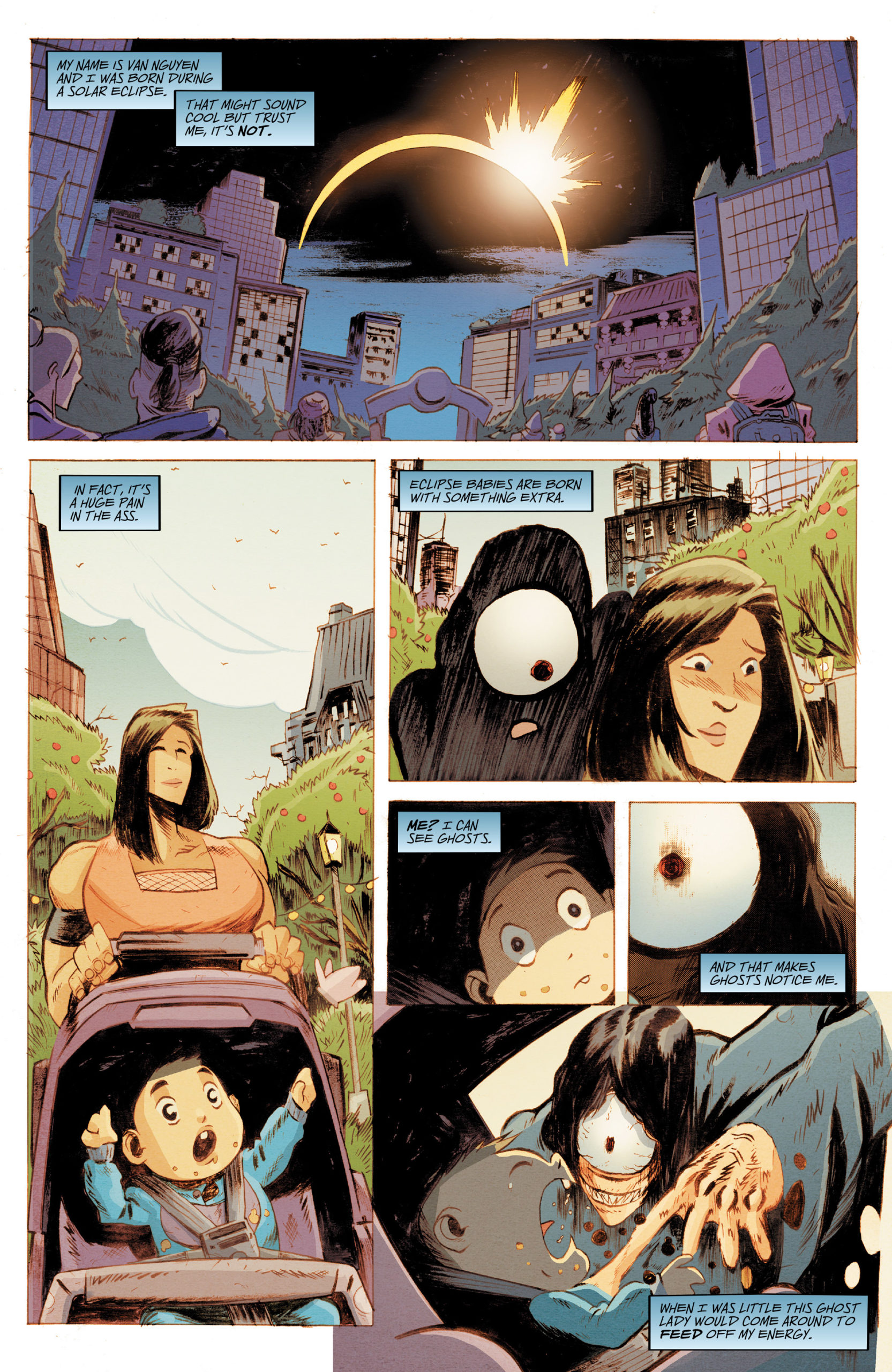 "Grammaton Punch provides a twist on the classic ghost story that is inspired by my love of video games, horror, and the paranormal,” says writer Miles Gunter, whose credits include BPRD, Terminator, and Weird War Tales. “In Grammaton Punch, Van Nguyen was born during a solar eclipse and while that might sound cool, it’s not. That’s because eclipse babies are born with something extra and, for Van Nguyen, that means he can see ghosts.”