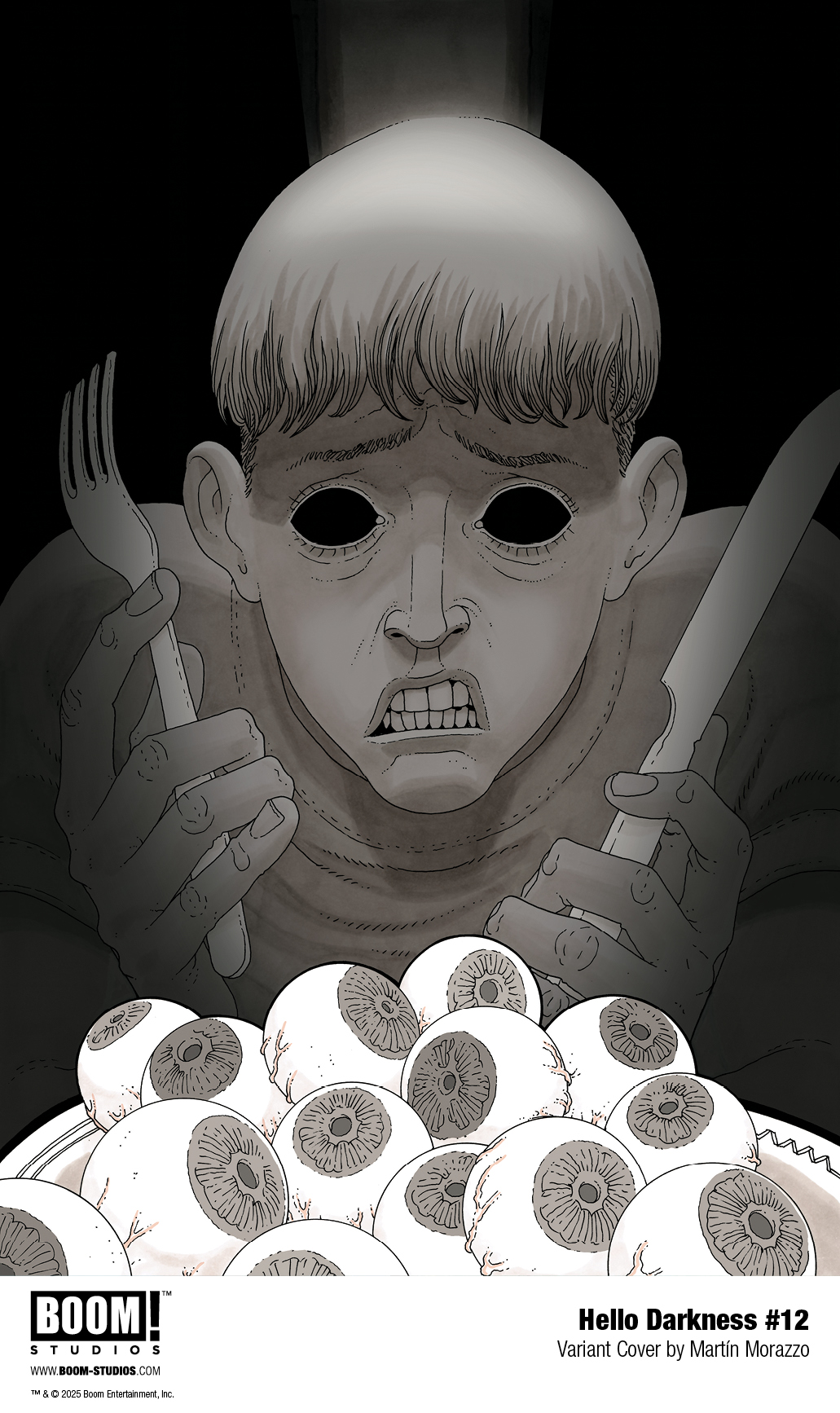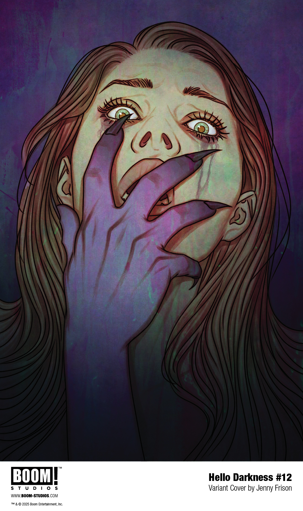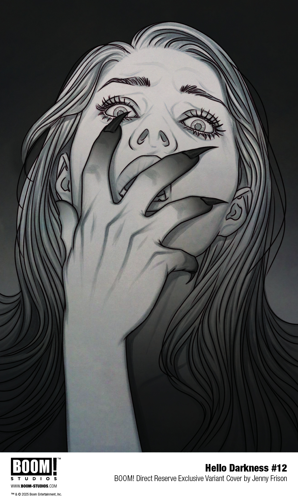 HELLO DARKNESS #12 features a main cover by Miguel Mercado (The Amazing Spider-Man), and variant covers by Jenny Frison (Something is Killing the Children), Martín Morazzo (Ice Cream Man), Dan Panosian (Alice Never After, The Last Boy), and a limited BOOM! Studios Direct Reserve exclusive variant by Jenny Frison!"