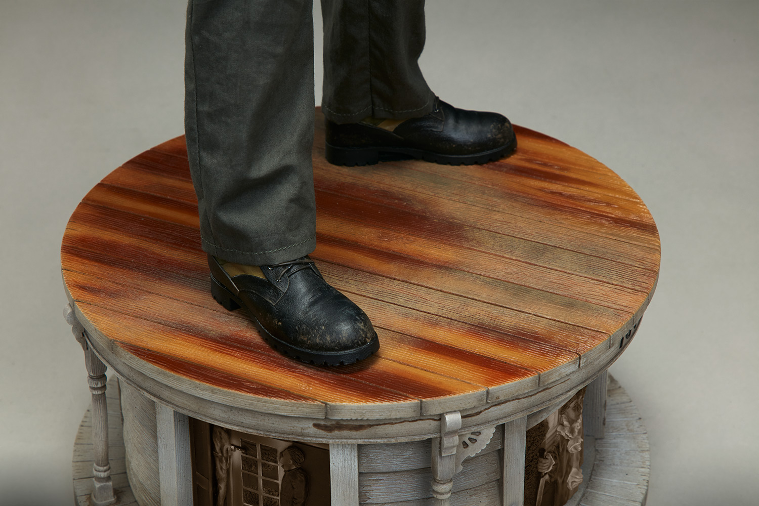 Four different sculpted window reliefs depict essential scenes from Michael Myers’ murderous history around the base, including Michael’s first kill as a child, the deaths of Bob Simms and Annie Brackett, and the harrowing closet attack as seen from Laurie Strode’s perspective. Rendered in sepia and detailed in three dimensions, these windows provide a horrifying view into the bloodshed Myers has brought home with him.