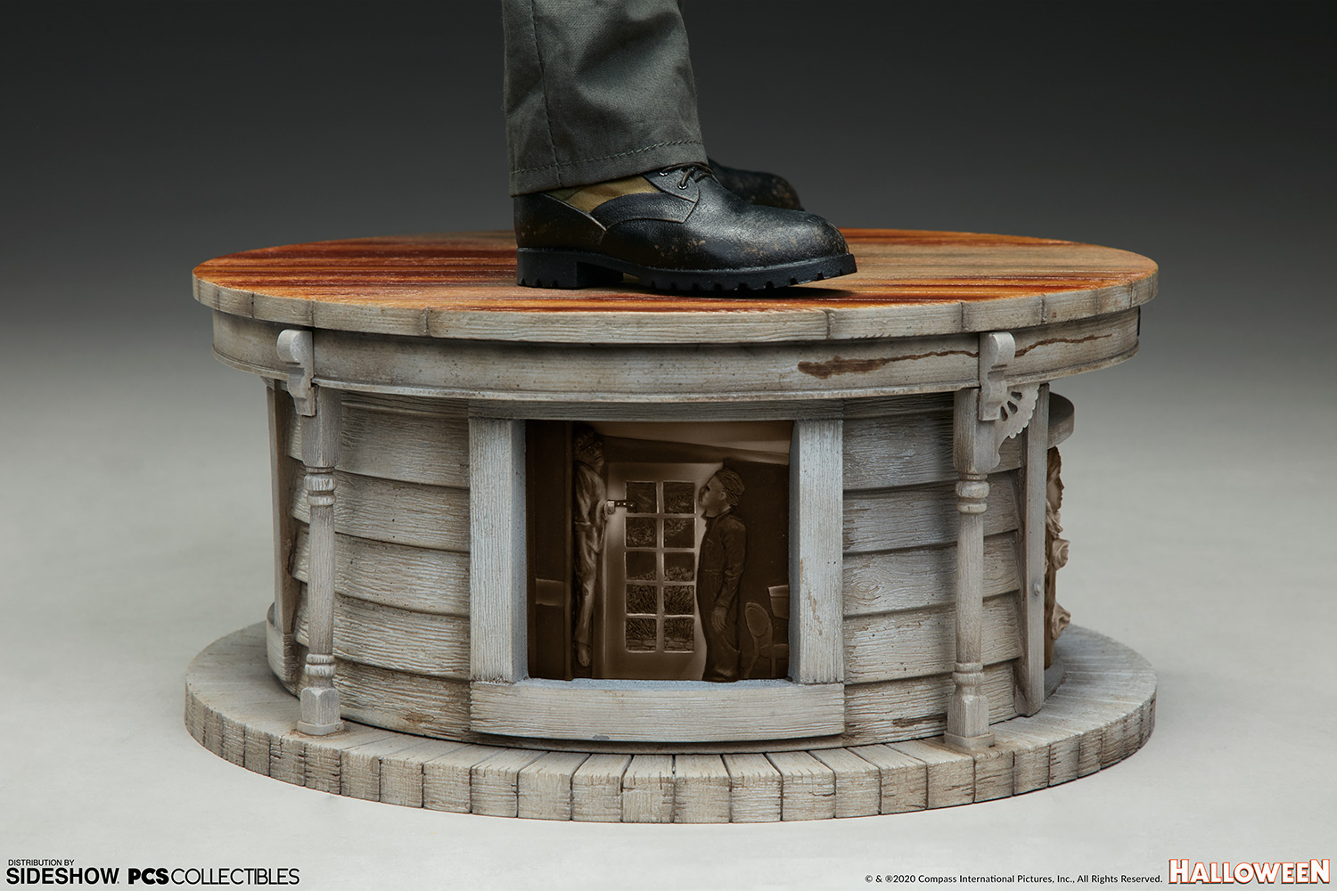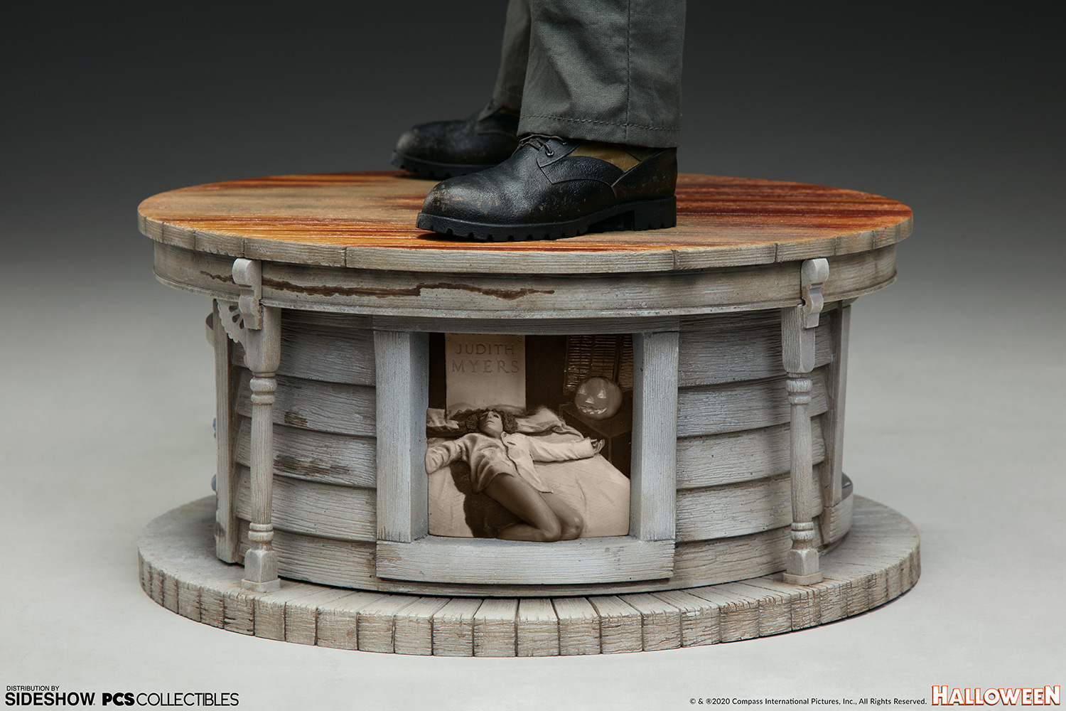 As featured on Bloody Disgusting, the new Michael Myers 1:4 scale statue depicts the butcher blade boogeyman as he appeared in the original Halloween. The statue stands 23 inches tall atop a base with windows that look into memorable moments from Carpenter's Halloween, from the claustrophobic closet scene to the brutal murder of Bob Simms.