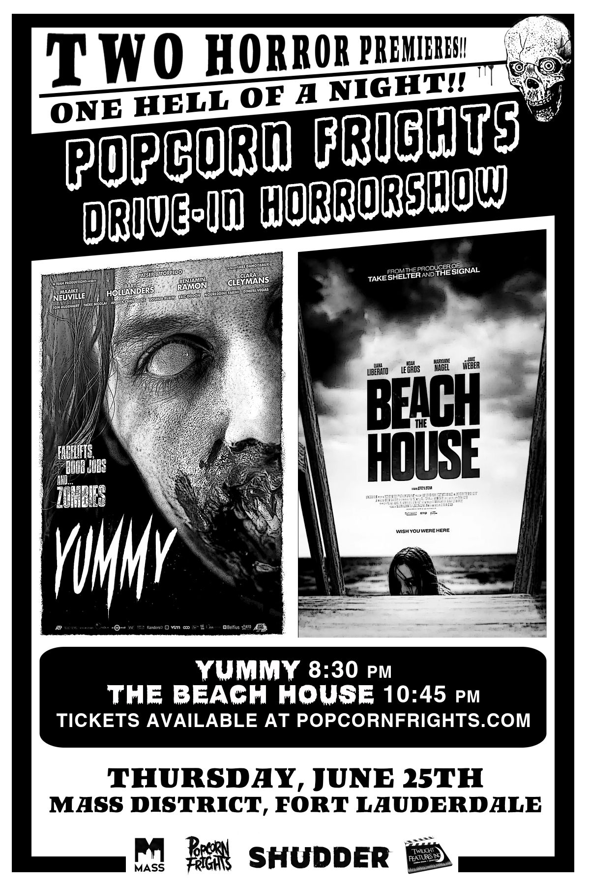 Press Release: FORT LAUDERDALE, FL - Popcorn Frights, the largest genre film festival in Southeast US, has partnered with Shudder, AMC Networks’ premium streaming service for horror, thriller and the supernatural, for its next drive-in horrorshow featuring a double-bill premiere of YUMMY and THE BEACH HOUSE on Thursday, June 25. The one-night-only event will also present a special preshow themed to the drive-in experience that will include international short films, rare nostalgic and weird video clips, and other surprises.