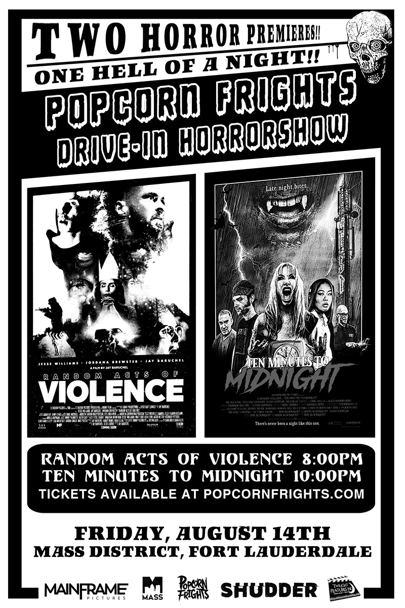 After keeping the horror genre alive and well in South Florida during the COVID-19 pandemic, the hard-working team behind the Popcorn Frights Film Festival is closing out their Drive-In Horrorshow summer screening series in safety and style on Friday, August 14th with the world premiere of the Caroline Williams-starring Ten Minutes to Midnight and the Southeast US premiere of filmmaker Jay Baruchel’s new horror movie Random Acts of Violence.