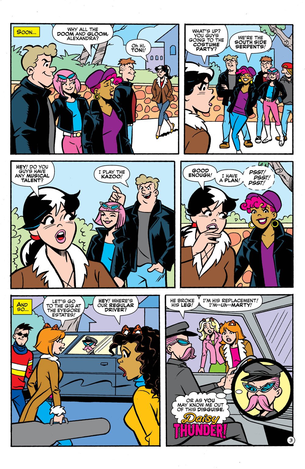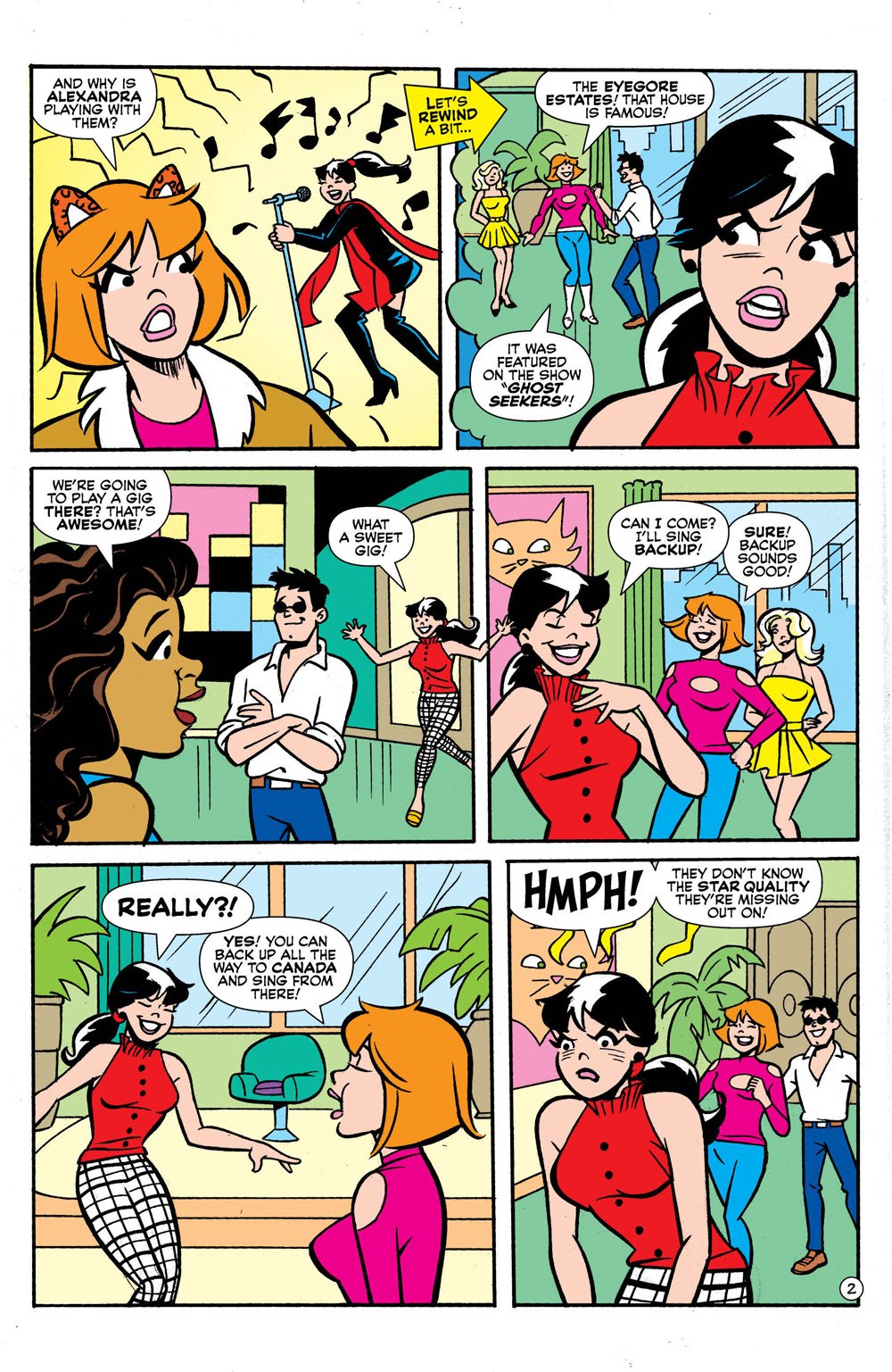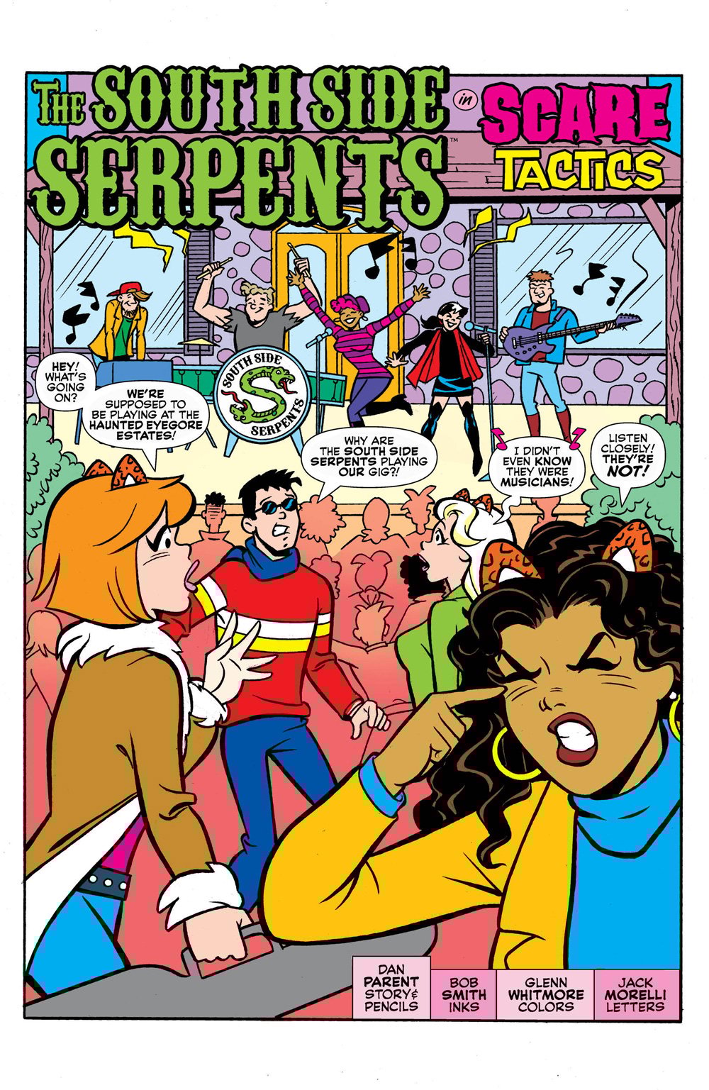 Josie and her bandmates are psyched to play at the eerie Eyegore Estates, but when Josie's frenemy Alexandra Cabot (herself no stranger to the supernatural) and the South Side Serpents team up to form their own musical group, it looks like there will be a killer battle of the bands for the ultimate ghoulish gig in our exclusive preview of the new story "Scare Tactics" from Josie and the Pussycats Annual Spectacular, haunting shelves beginning November 19th from Archie Comics!