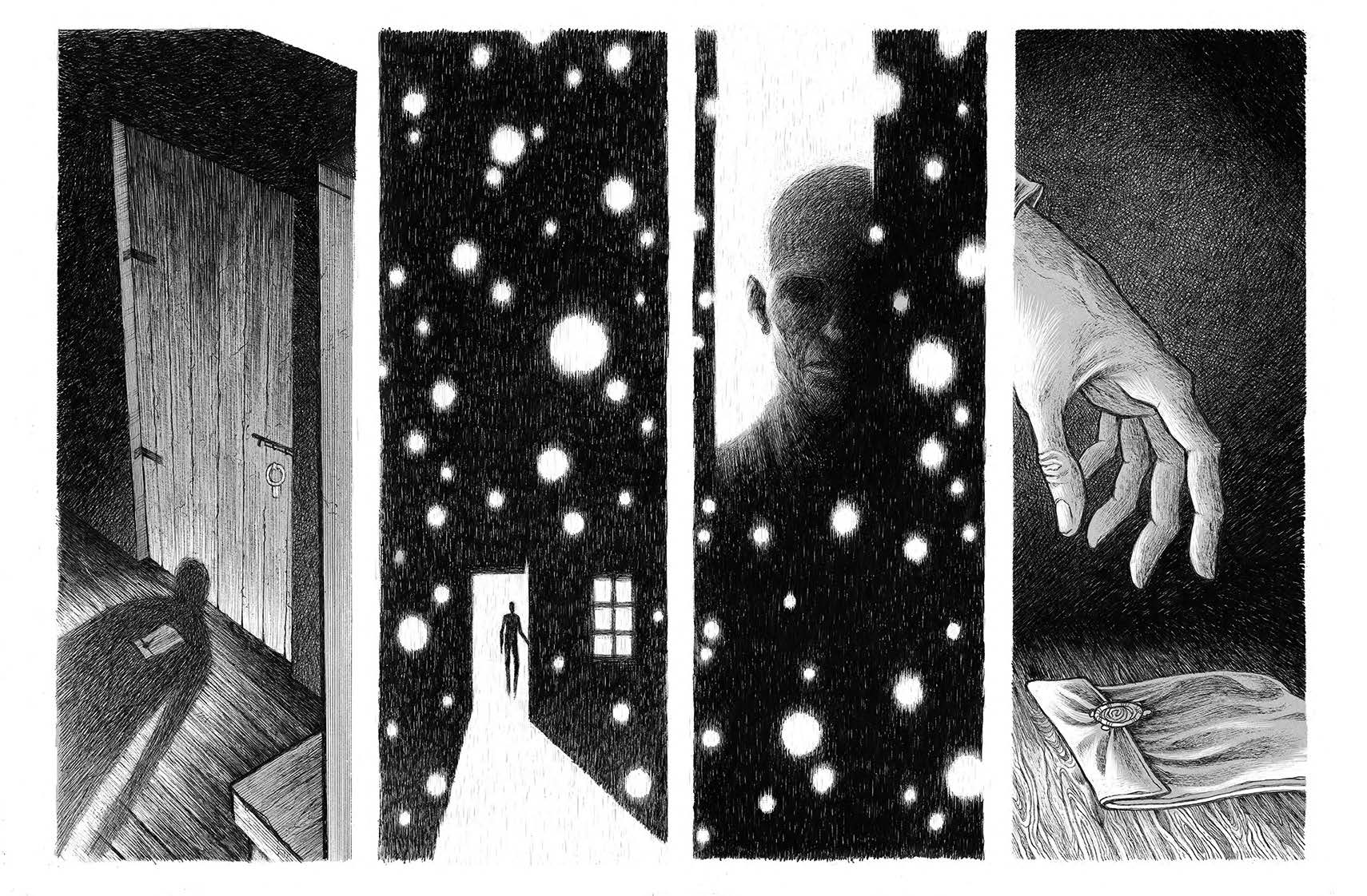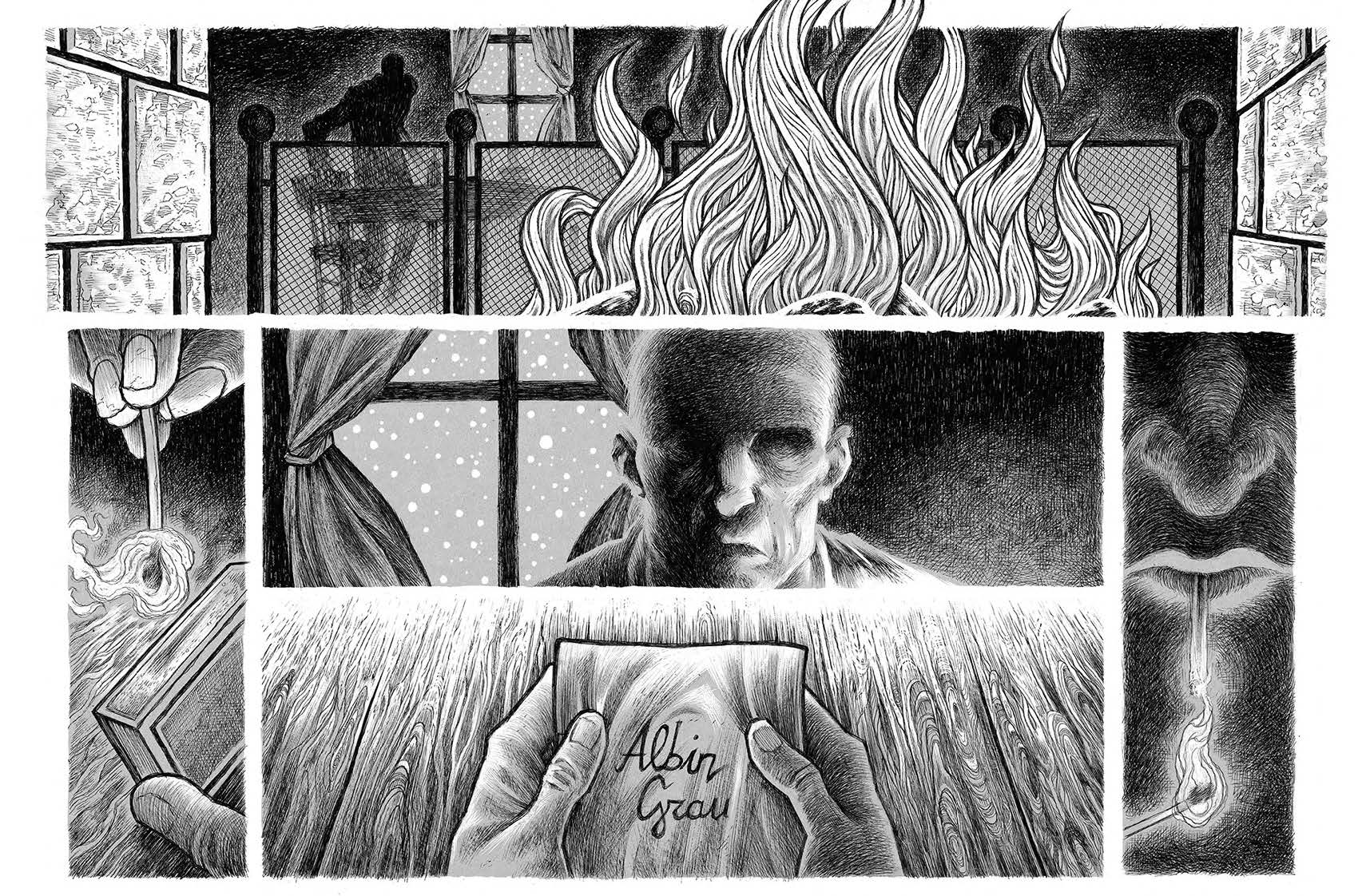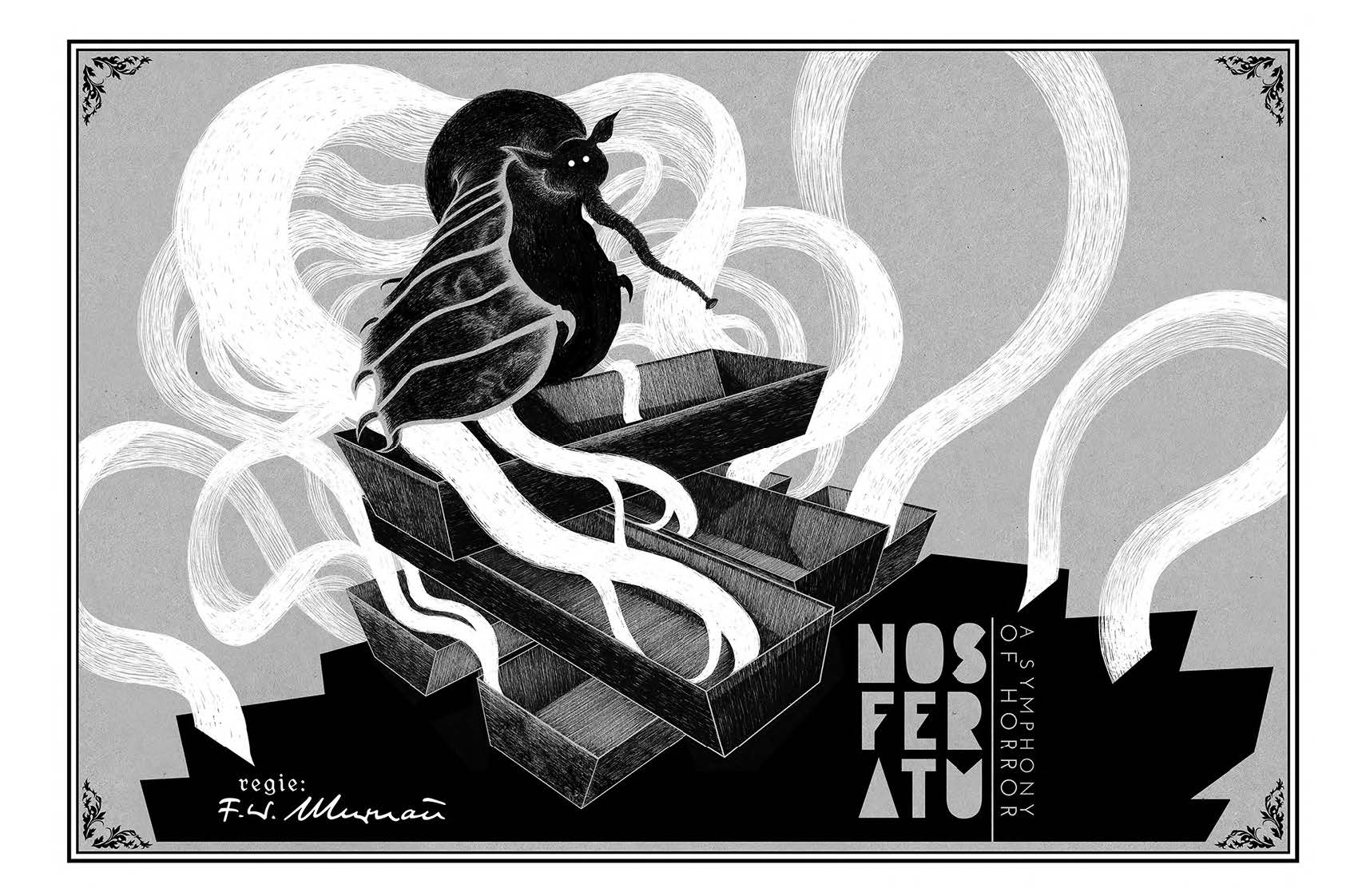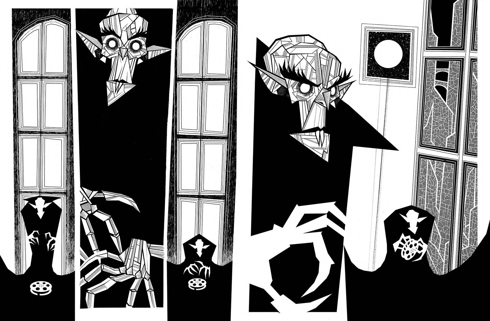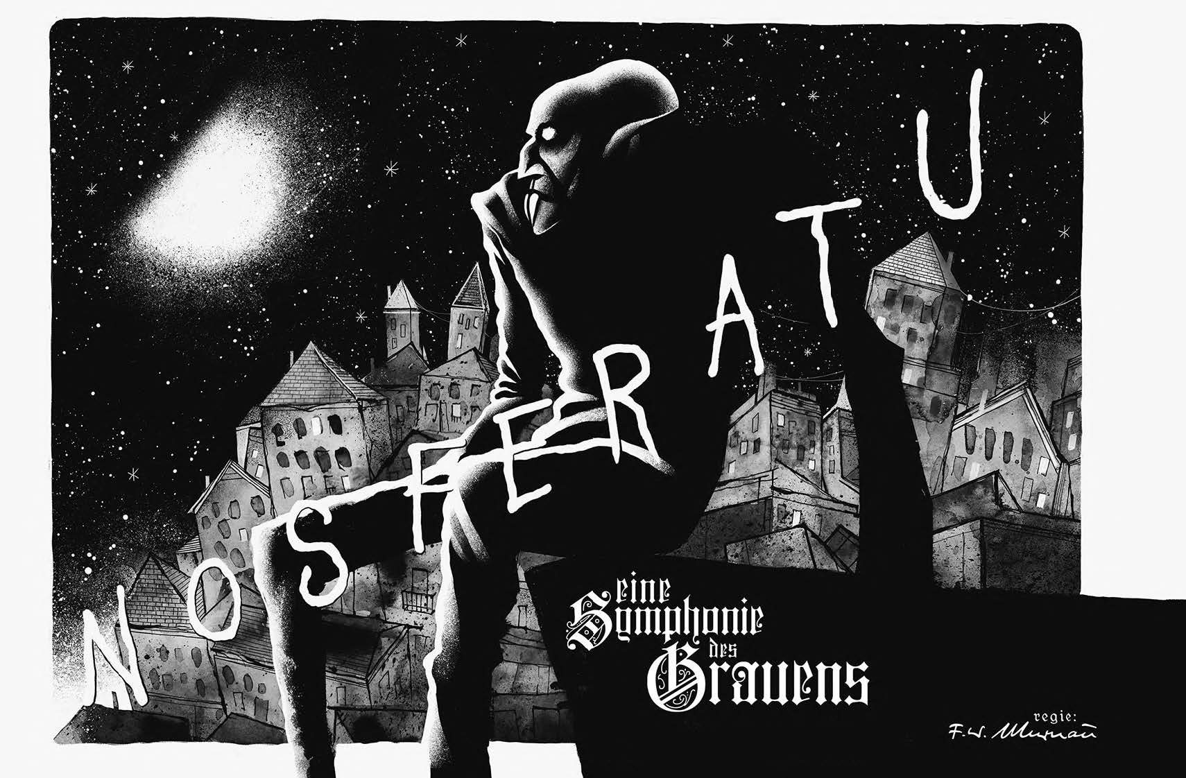 In addition to Fontanili’s painstakingly detailed exploration of the history of the film and its enigmatic director, this high-end landscape hardcover edition features a wealth of extra material, including behind-the-scenes sketches, process drawings, and the author’s own journey to follow the path taken by F.W. Murnau’s skull, which was stolen soon after the director died. It is this level of commitment and detail which speaks most to Marco’s dedication to the film and this project.