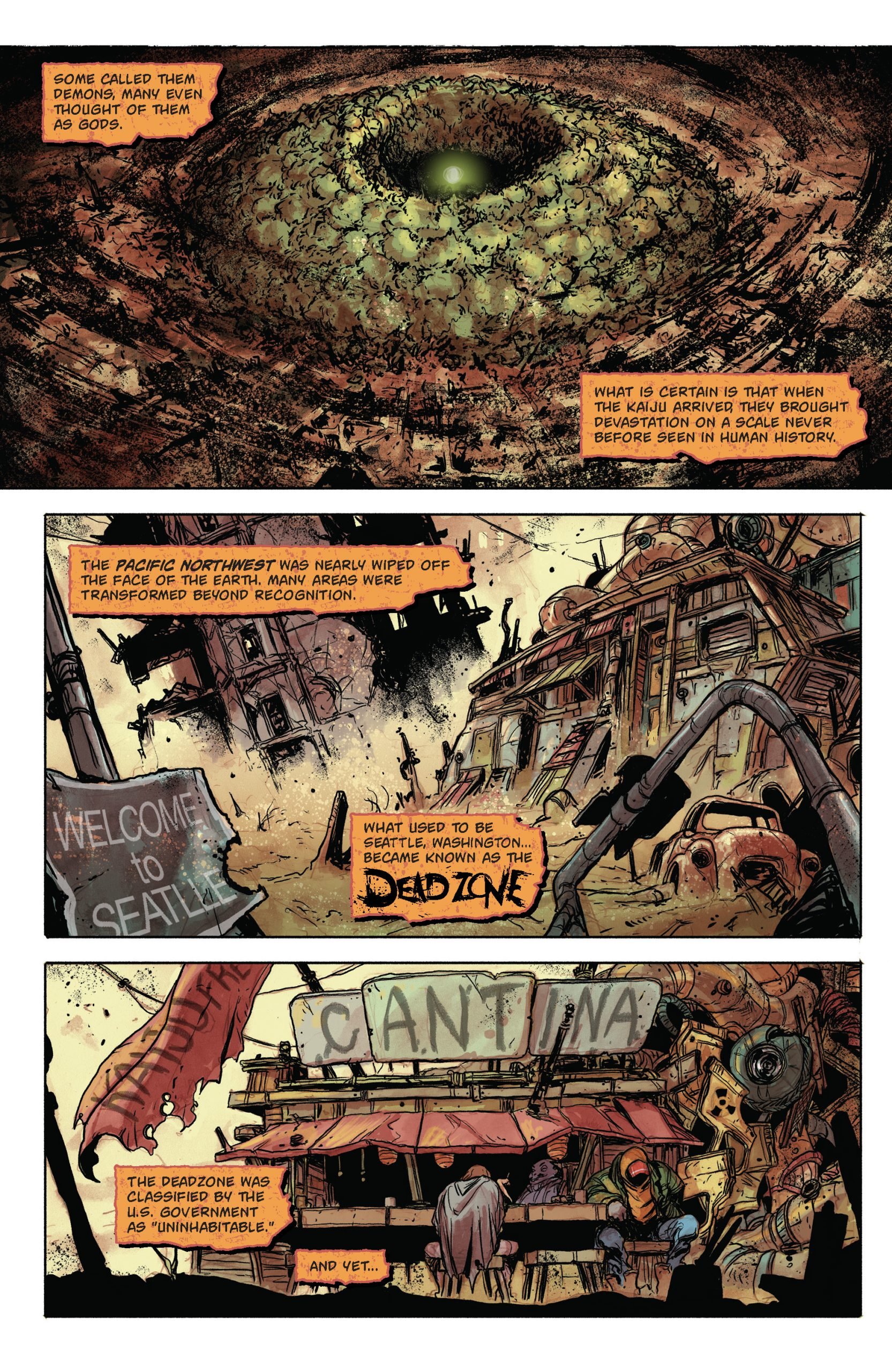 I’m also really loving the concept of this quarantined Deadzone, especially since it’s full of dangers beyond the usual massive Kaiju. Can you give our readers some of the backstory behind the existence of the Deadzone?