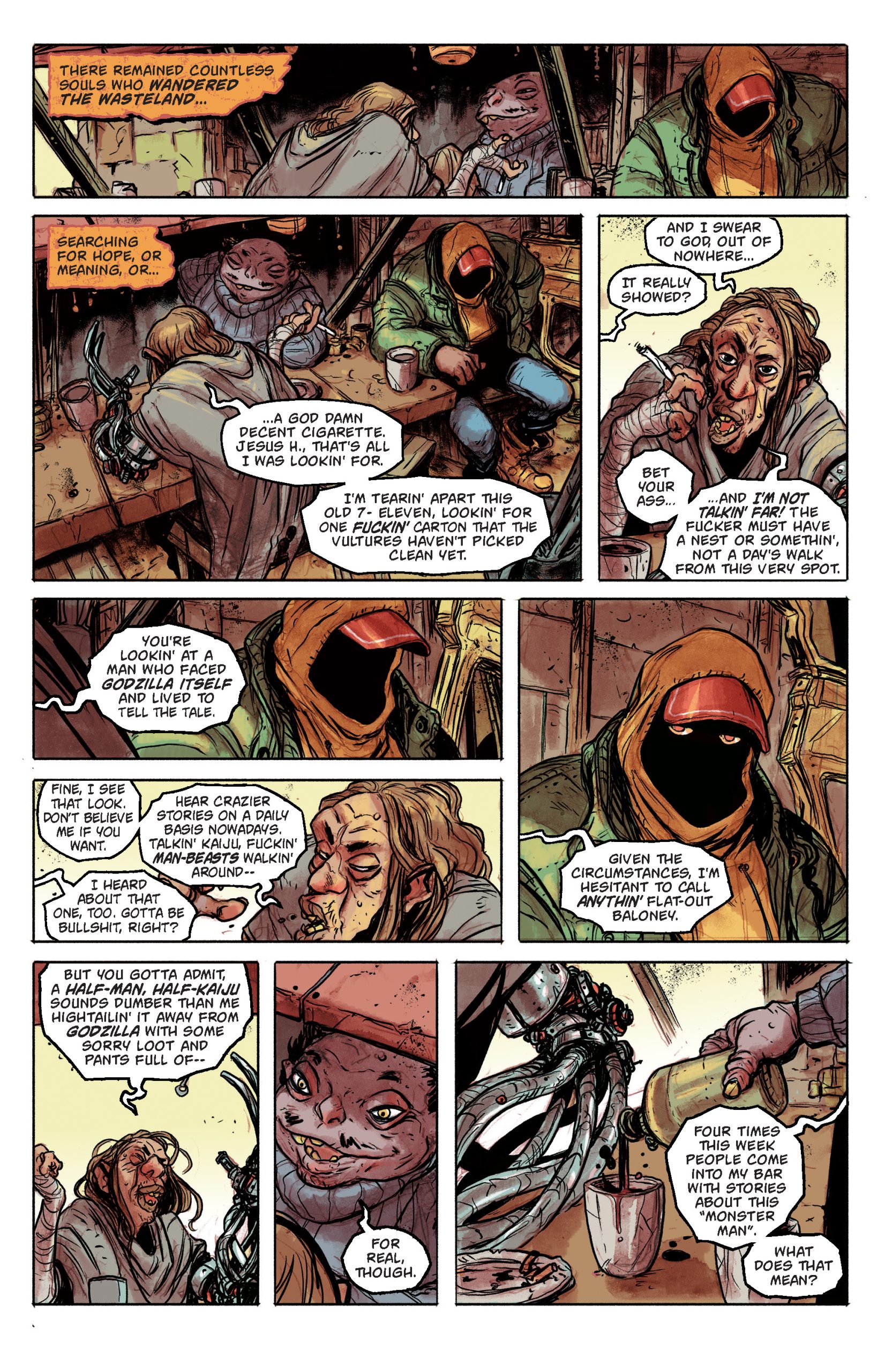 ESP: Our wonderful editor Jake Williams is the engine behind this thing. He came to us at San Diego Comic-Con and laid out his plan for expanding Godzilla’s universe, including a wasteland full of kaiju. We pitched him a million different concepts before we settled on our core group of characters, and many of those other fun ideas will be seen in later issues as we still ended up finding them a home in the Deadzone. Toho has given the official seal of approval on all these new additions to the Godzilla mythos, and they’re delightfully supportive when it comes to greenlighting the craziest and most exciting concepts.