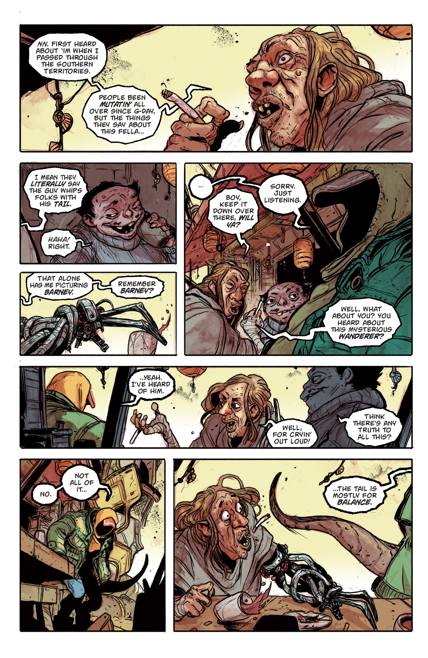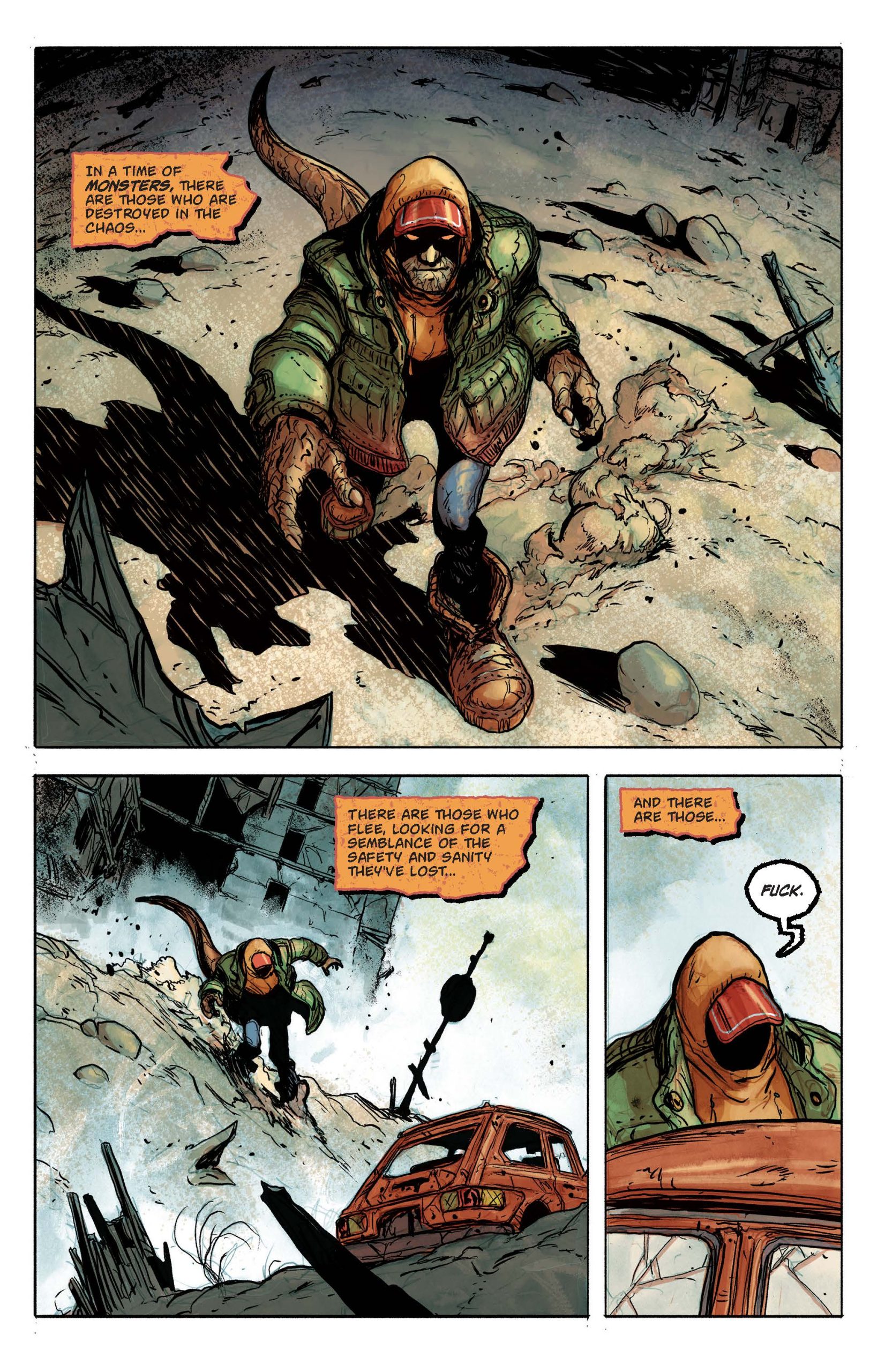 ESP: It became evident early in our discussions about this book that our Mad Max-esque world needed a Max, or a “Man with No Name” style character who could go toe-to-toe with the most frightening creatures the Deadzone has to offer. He’s a vicious fighter with a mysterious past, but what’s really exciting about him is his dual-nature. He knows what it’s like to survive as a human in a world of monsters, but he also has this other side to him that is a rageful beast. He walks between those worlds, and it makes him unpredictable. And badass, obviously.