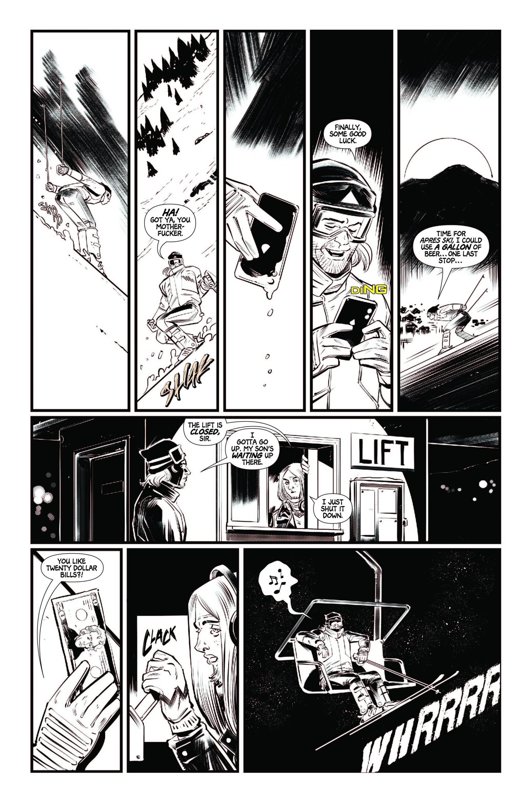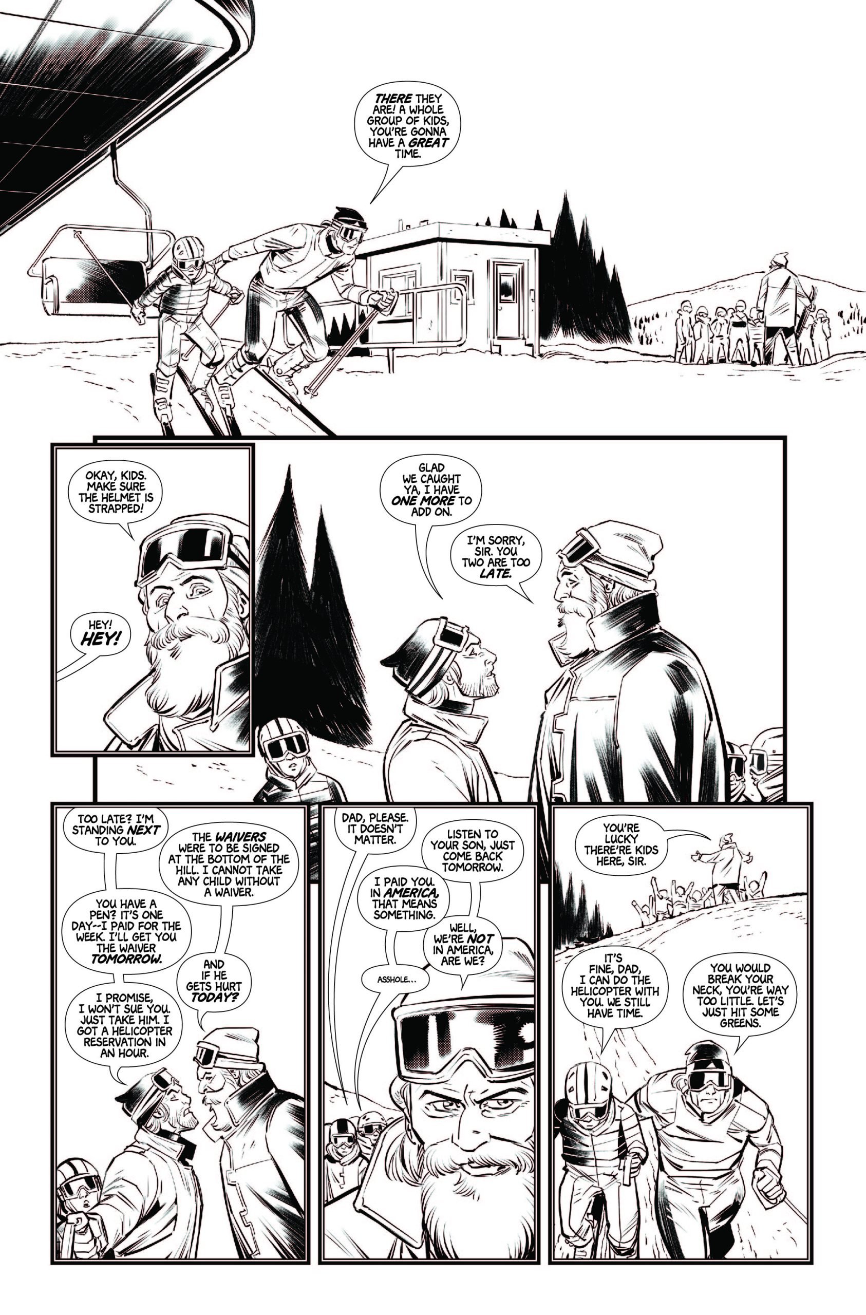 Brendan Columbus: I really like horror that shows the weird and horrific undercurrents of the seemingly normal. Communities with secrets, anything occult, secret cabals, I love it all. So with Black Diamond I wanted to show a sanitized version of a culture, here Tysil being made into this Disney-esque resort town for Americans to come and ski at, but to show that the unsanitized culture, specifically some of the old Norse lore, was still hiding beneath the surface, never fully gone.