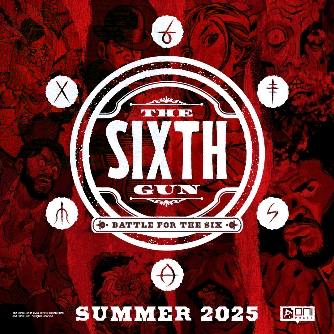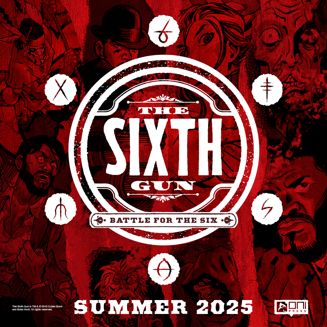 Press Release: PORTLAND, OR (March 20, 2024) SOMETIMES WHAT'S DEAD DOESN'T STAY GONE! Oni Press, the multiple Eisner and Harvey Award-winning publisher of groundbreaking comics and graphic novels since 1997, is proud to announce the long-awaited return to the Eisner Award-nominated world of THE SIXTH GUN this July as acclaimed co-creators Cullen Bunn (Harrow County) and Brian Hurtt (The Midnite Show) usher in THE SIXTH GUN: BATTLE FOR THE SIX #1 – an all-new, self-contained entry point into the acclaimed saga that fantasy icon Michael Moorcock calls "an epic in its own right," as told across three extra-sized and ad-free prestige format issues all summer long!