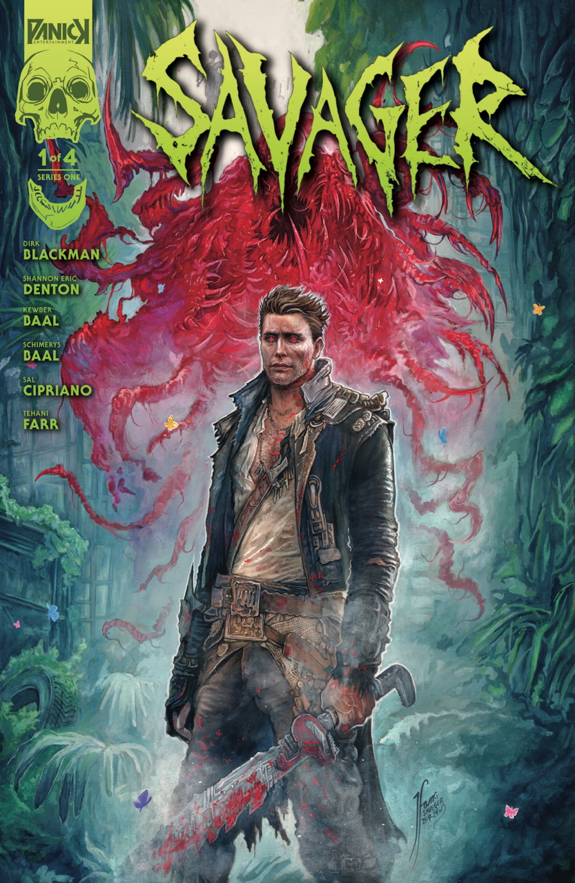 A blood-soaked post-apocalyptic Western set nearly 100 years after Earth is taken over by cosmic parasites, Savager #1 is now lurking on shelves from PANICK Entertainment, and ahead of the second issue's release in November, we caught up with co-writers Dirk Blackman and Shannon Eric Denton as well as artist Kewber Baal to discuss their new comic book series, including looking at the post-apocalypse through a vibrant lens, creating a unique bond between the last human standing and the parasite within him, working with colorist Schimerys Baal and letterer Sal Cipriano to bring this story to life, the mutated horrors awaiting readers in future issues of Savager, and the amazing covers by Tehani Farr, Christopher Lair, and Shane Pierce, respectively.