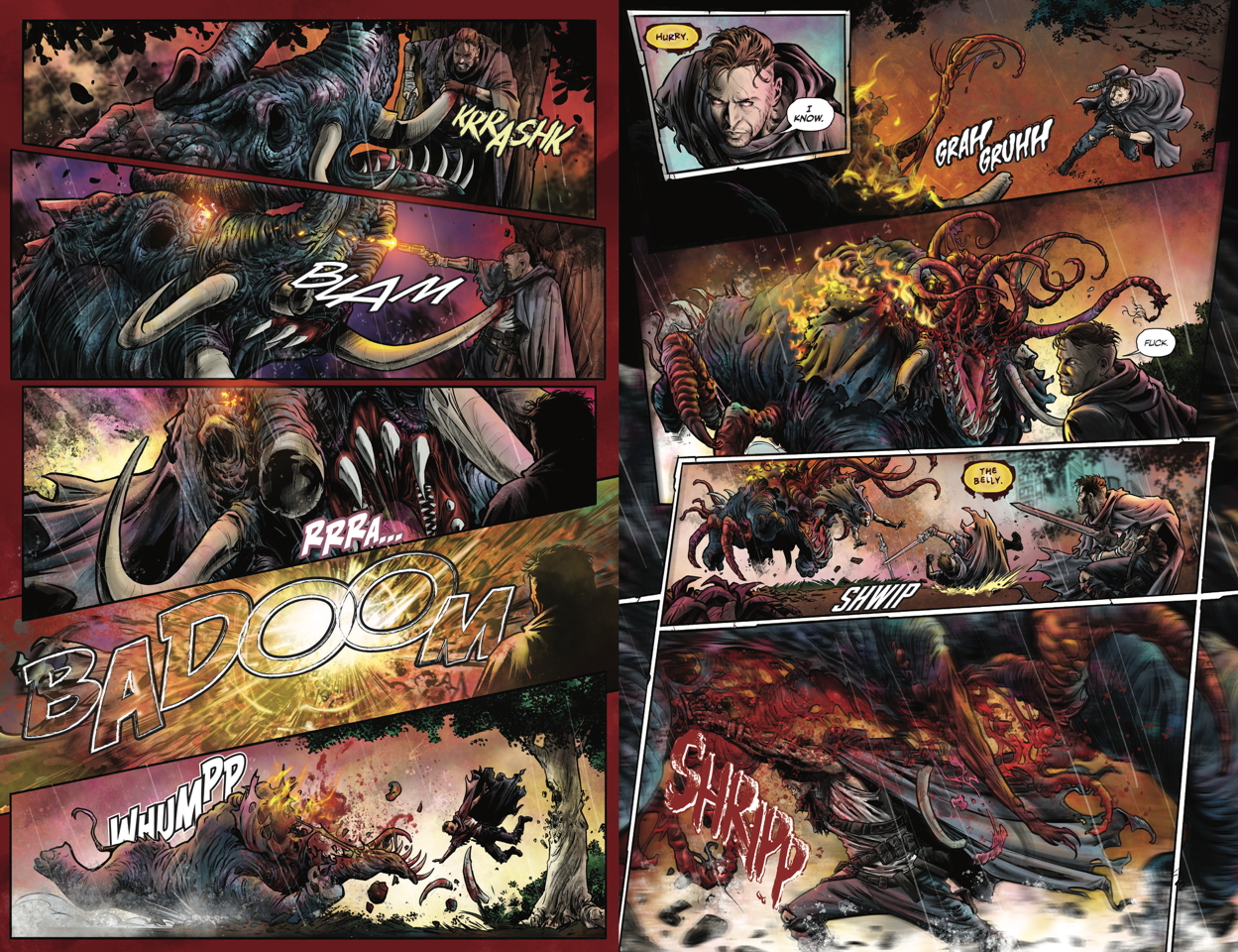 Shannon Eric Denton: I’m excited for folks to see how much action we pack into each issue while also allowing you to absorb the extensive world-building without slowing things down to explain it. There’s some epic monster fighting while also sincere and heartfelt questions about what existence is versus just surviving.
