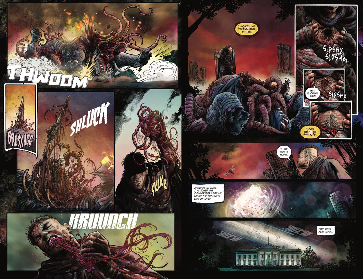 Dirk Blackman: It's hugely important. First, from a story mechanics angle, we wanted to set this far enough in the future that there were no people or animals left except for Riley. We needed a practical reason why that could be. From the superhero angle, it allowed us to do terrible things to Riley because the creature could heal him. And then from the character angle, it gave Riley another being to communicate with, even if it was a monster inside him. And it's fun to have him talking to himself like a basket case, even though there really is someone else there. As for future series—if we get to write one—it will turn out that Riley isn't just using the creature to help get his revenge, the creature is also using him for its own nefarious ends.
