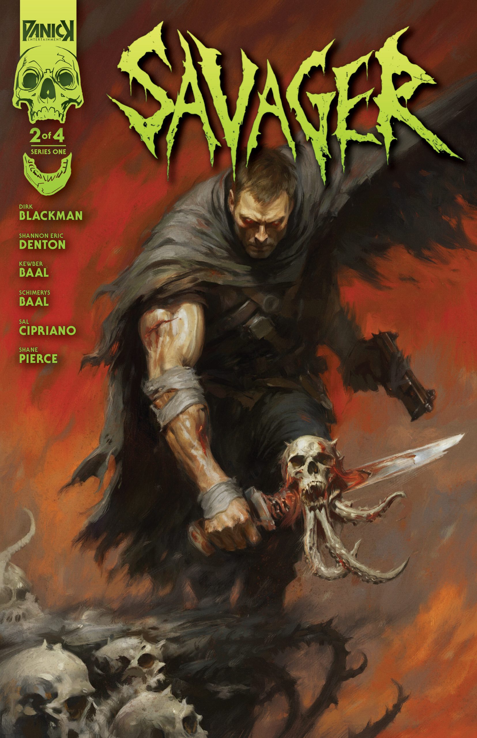 Panick Entertainment Presents: Savager. Nearly 100 years after Earth fell to cosmic parasites, seemingly only the SAVAGER — Riley Phillips, a former secret service agent fused with a deadly alien - remains. Alone and driven by vengeance, he roams the wasteland, guided only by the voice inside him. But when he discovers a living human, everything changes. Can a monster that was once a man become humanity’s last hope in this bloody post-apocalyptic Western? Interior art: Kewber Baal. Cover A: Tehani Farr.