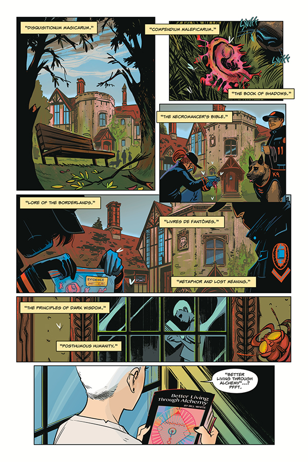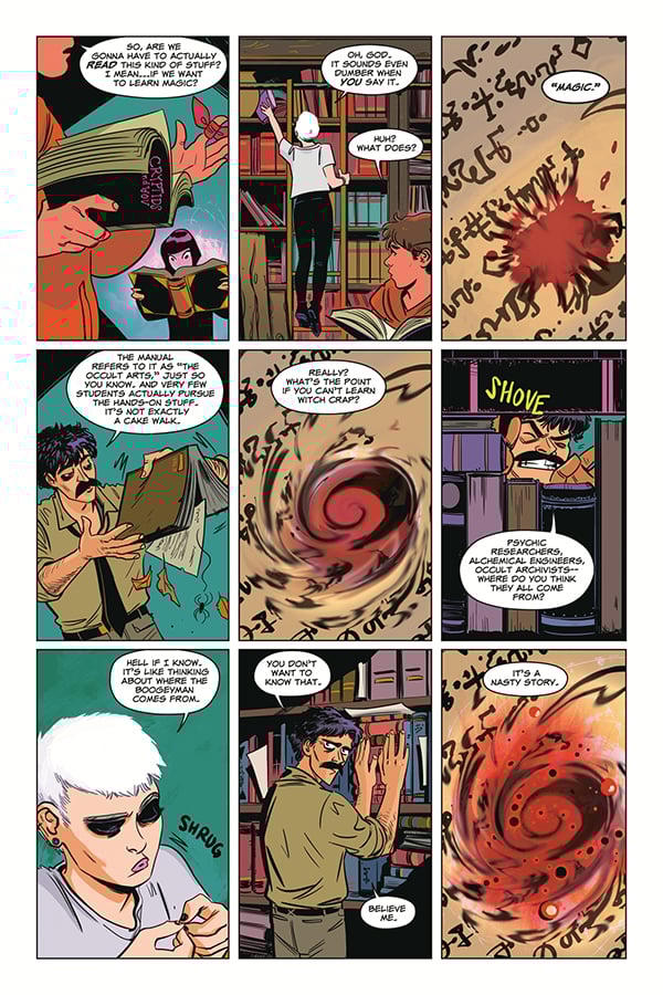 Evan Dorkin: Blackwood was influenced by movies like Return of the Living Dead, Fright Night, Re-Animator, and Evil Dead 2, as well as a few school comedies like Real Genius and Animal House. You can tell by those references how old I am (old). My main inspiration in writing Blackwood and Beasts is horror fiction and folklore. Weird Tales and other pulps, weird fiction/cosmic horror, supernatural stories. Blackwood leans much more towards horror and weird fiction than fantasy. We don't have brooms or wands, magic co-exists with science, and conventional tools and weaponry. Our students will reach for a beer more often than a spellbook. Most of them won't learn traditional magic because they'd suck at it.