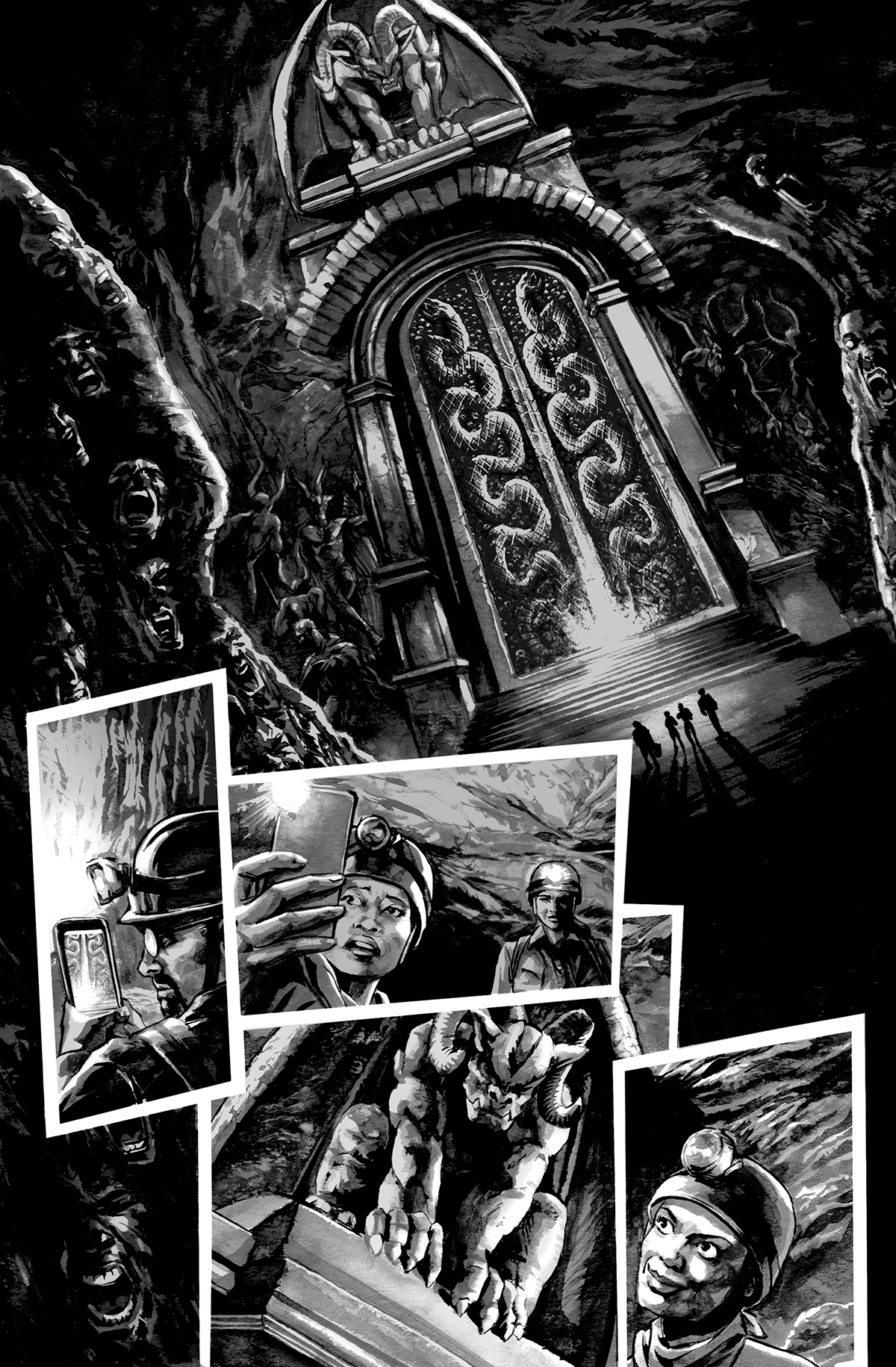 Your story in Darkest Depths, “The Gate,” follows a group of spelunkers who discover a deadly door to unfathomable horrors, and the preview pages give off vibes of The Descent and The Keep. When did you initially come up with the idea for “The Gate,” and what was it like collaborating with artist J.K. Woodward and letterer Tom Napolitano to bring it to life?