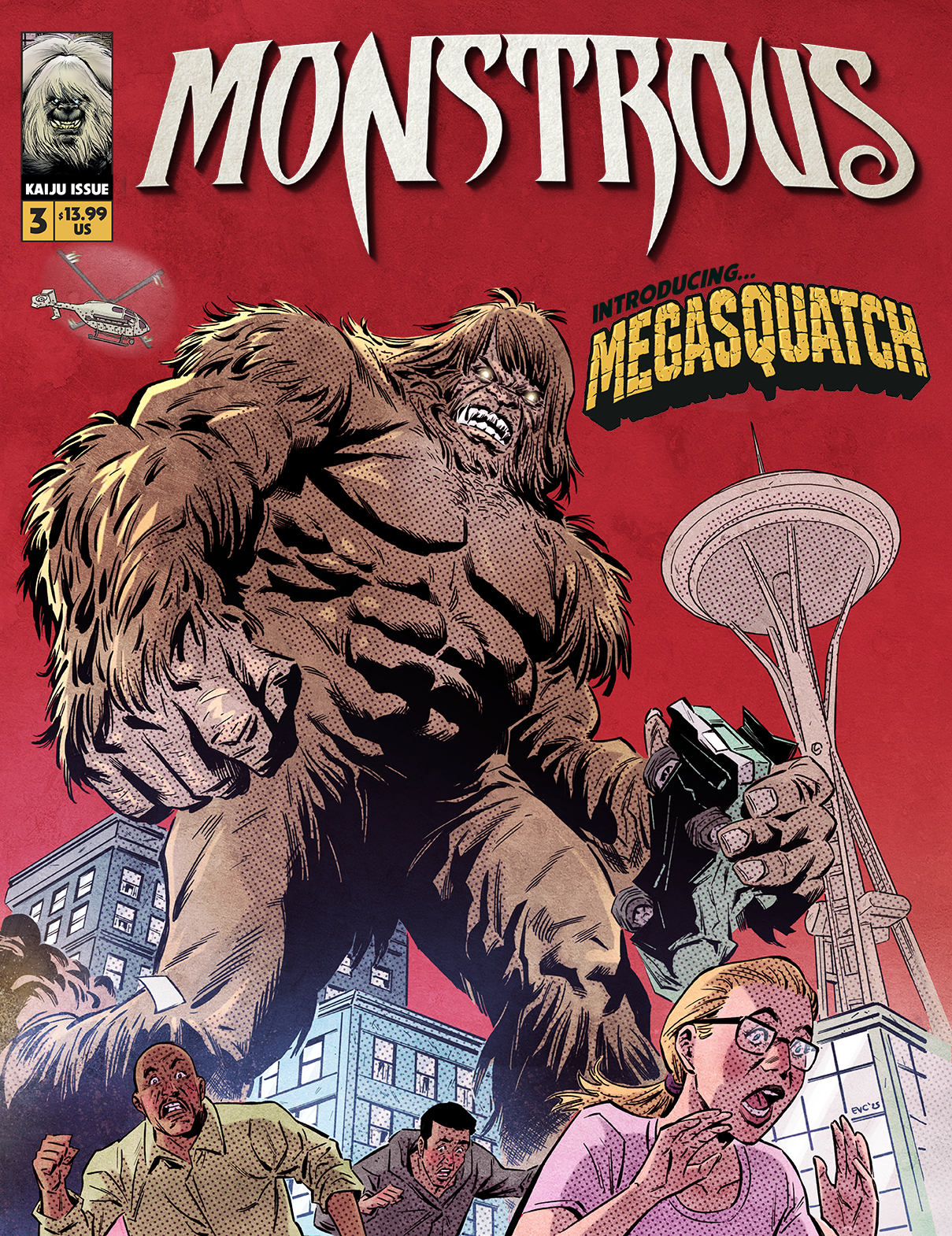 James Aquilone: There’s the oversized Monstrous: The Kaiju Issue that comes in three covers, exclusive art prints, a MegaSquatch T-shirt, the first issue of my new comic book series Monstrous Presents, and a limited-edition Konga – Gorgo Challenge Coin.