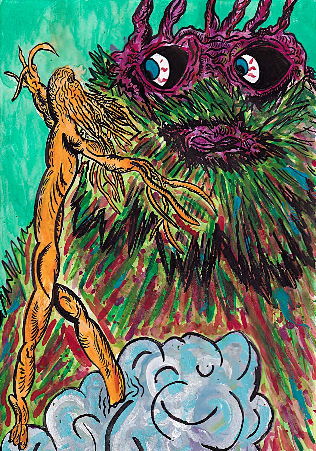 Drawing inspiration from medieval illuminated manuscripts, the work of Leonora Carrington, Max Ernst, The Fleischer Brothers, and cartoonists like Gary Panter, Marc Bell and Julie Doucet – Holland vividly illustrates all 130+ pages of this classic tome with a contemporary outsider-art flair. Each chapter features a full-page painting, and every page features painted borders that are as decorative as they are illustrative.