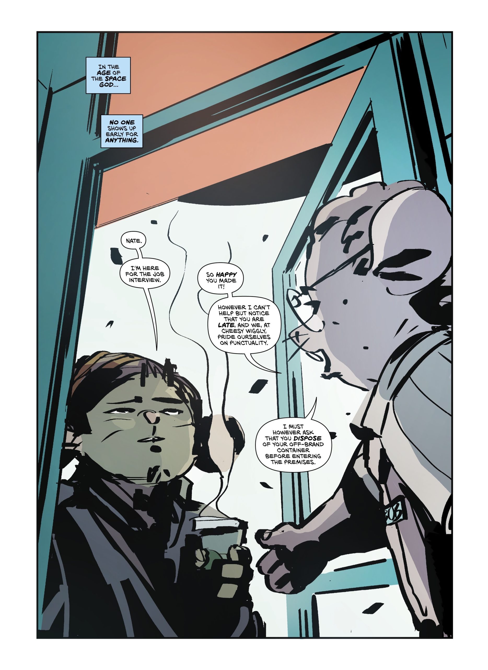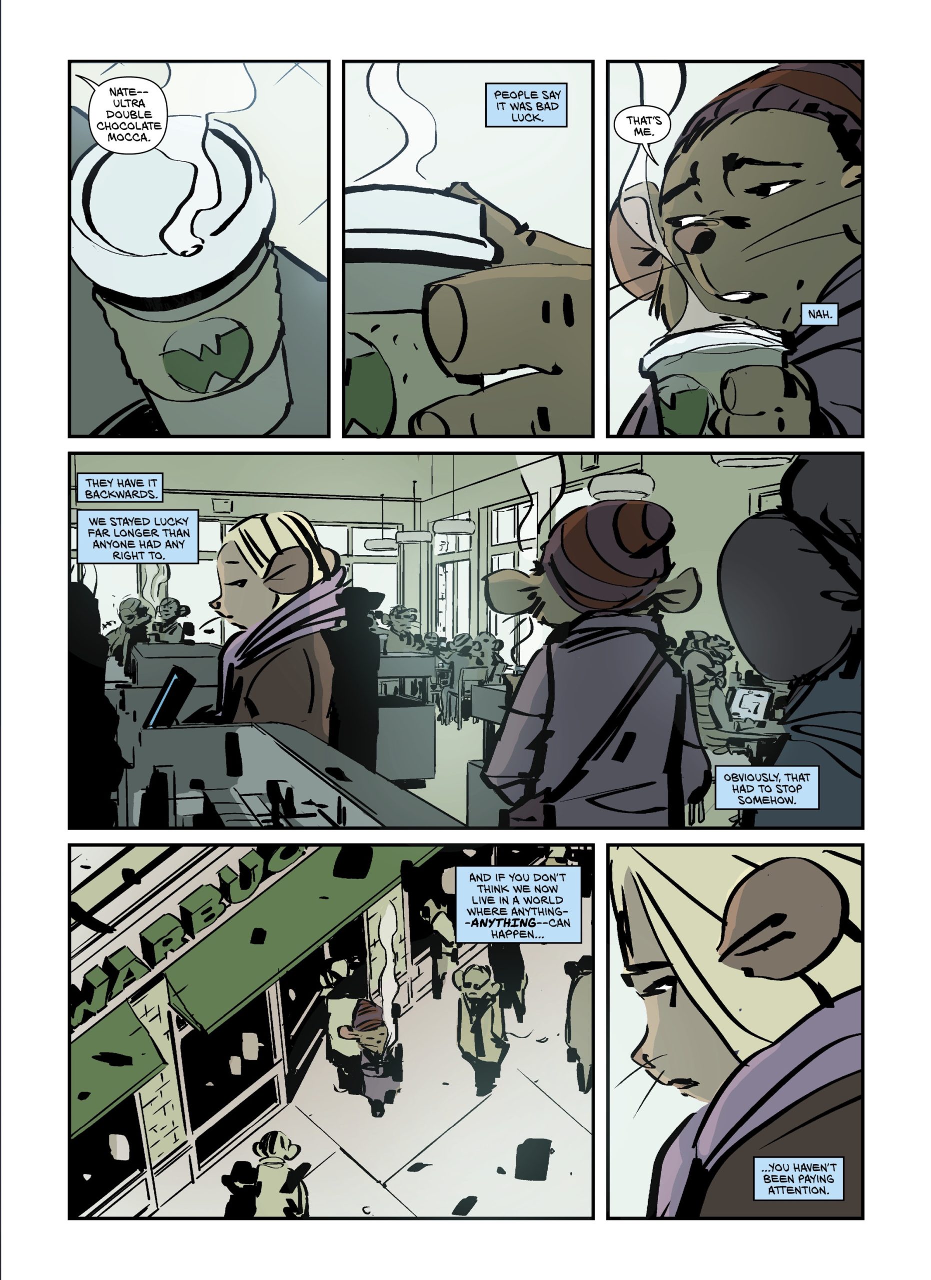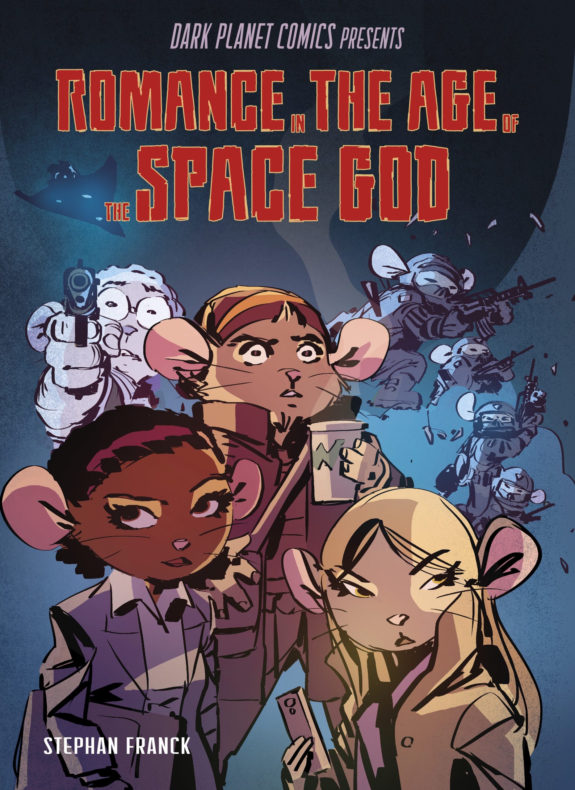 “ROMANCE IN THE AGE OF THE SPACE GOD is a strange comic for and about strange times,” said Franck. “It is cute and funny, it is sci-fi and dystopian, it has political satire and the kind of slice-of-life that I love. It introduces Nate, Lydia, Anya, all looking for their place in a difficult world, all profoundly human — even though they are adorable little mice. It started as a webcomic, but the plan was for it to be released in print, in an oversized format like a magazine. We did a very, very limited run last year just before San Diego Comic Con and it immediately sold out. The time has come to pull out all the stops and bring this comic to a much wider audience. It’s a little weird gem of a comic, and I hope you will give it a shot!”