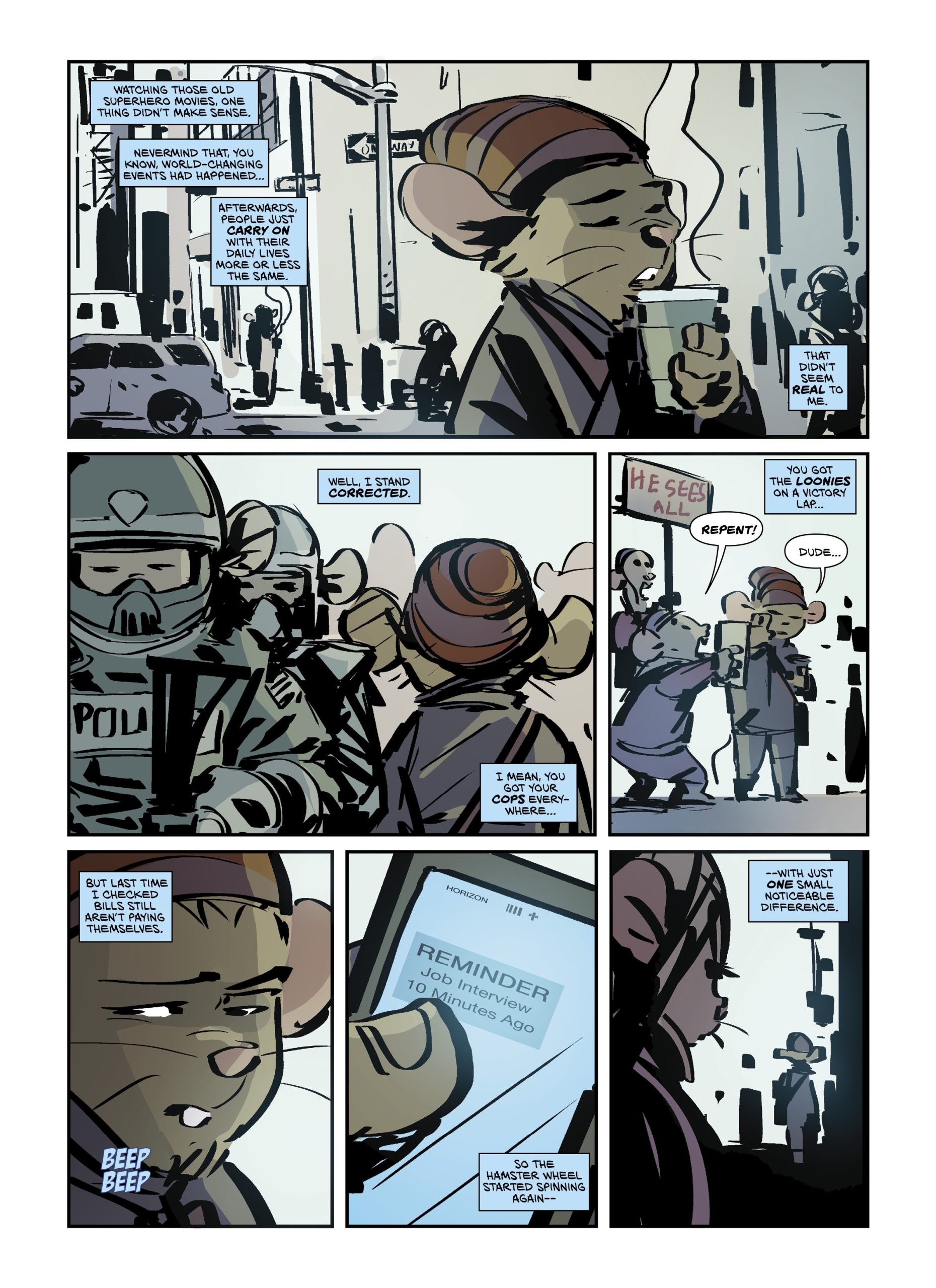 Well, there is Romance in the Age of the Space God, a one-shot magazine-size graphic-novella… which is also part of this campaign. I call it a comic for and about weird times–it’s got bits of sci-fi dystopian thriller, fun slice-of-life comedy, and a smidge of political satire! Oh, and it’s done with cute anthropomorphic little mice… It’s unlike anything you’ve seen.