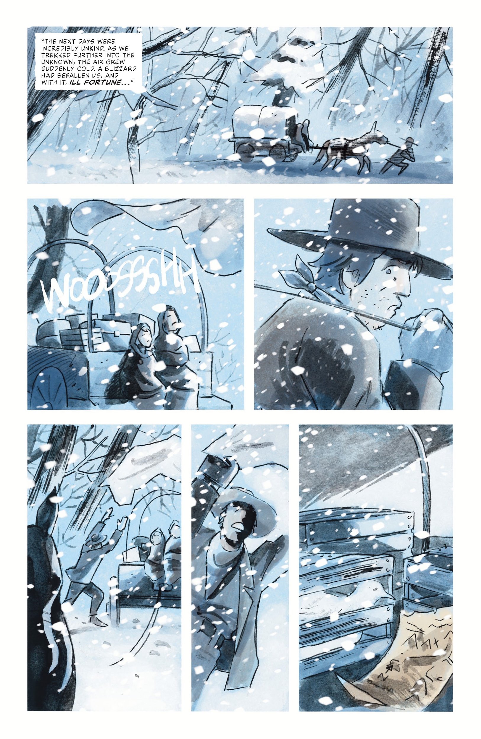 Chris Condon: The Shining meets True Grit is certainly a way to think of The Goddamn Tragedy, and that was intentional. I’m very glad that you picked up on that. I had recently done a lot of Western research to write The Enfield Gang Massacre, the Image Comics miniseries I did with Jacob Phillips in 2023 and 2024, so a lot of that was still on my mind, specifically something like Unforgiven or the work of Sergio Toppi. There’s also a great book about the Donner Party that was quite influential called “The Indifferent Stars Above.”