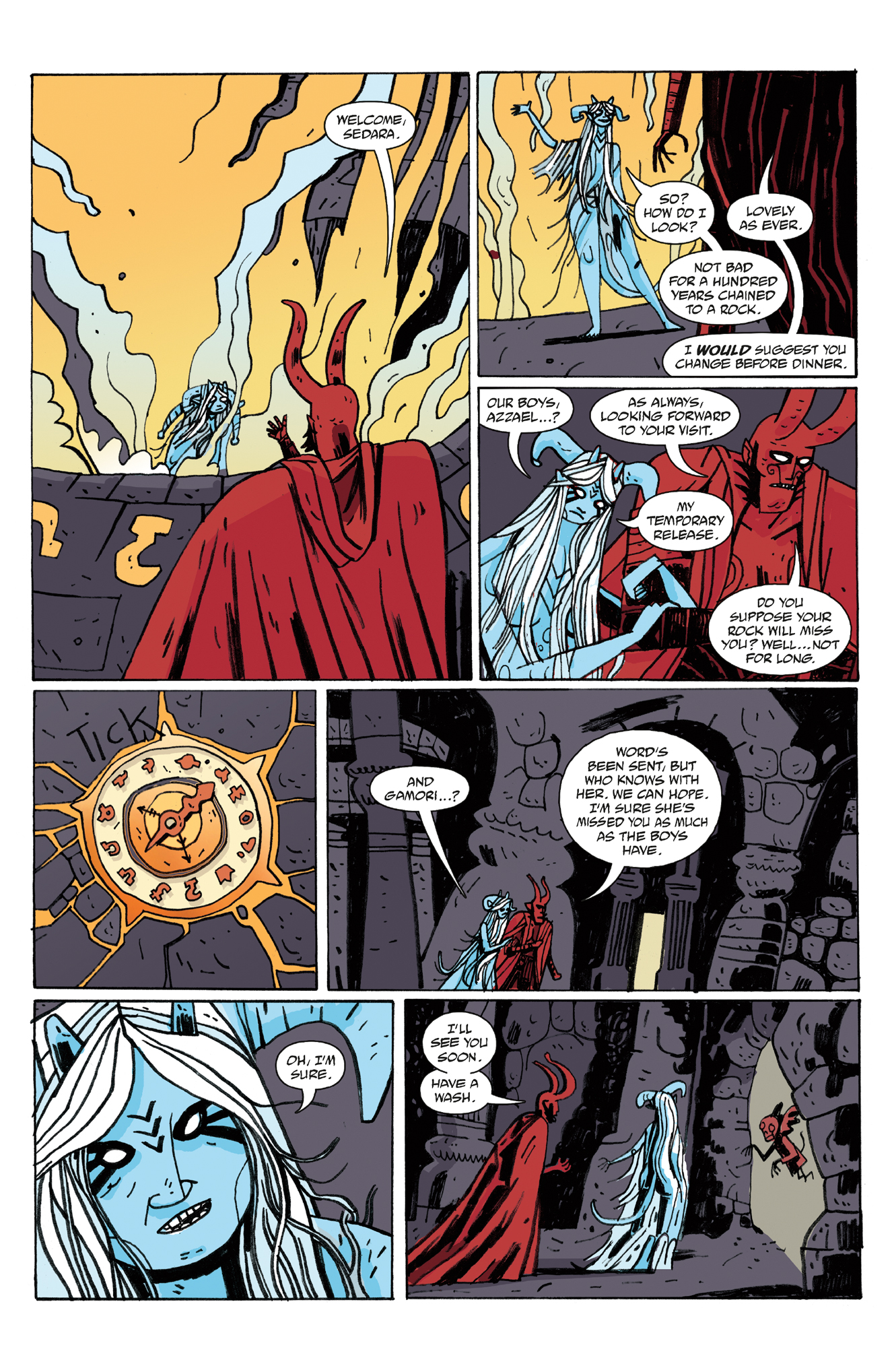 The Crown: A Tale of Hell stars Hellboy’s brothers Gamon and Lusk, who first appeared in Mignola’s beloved 2012 series Hellboy in Hell, as they fight for control of Pandemonium in this demonic family reunion. But it isn’t just the siblings who get involved in the power struggle, as their mother returns from her prison for the first time in a hundred years with plans of her own.