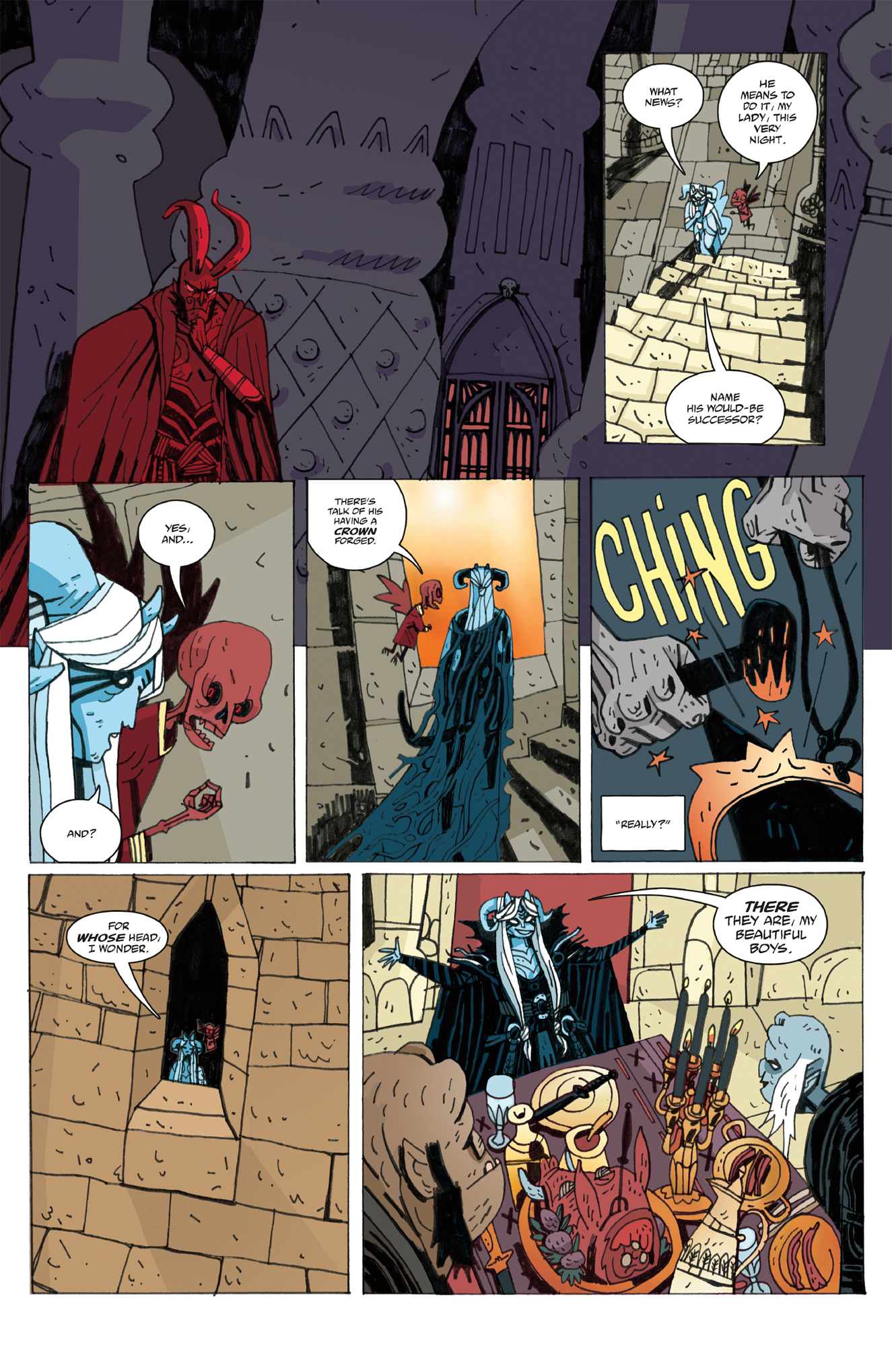 Todd Mignola: After their brief appearance in Mike’s HIH [Hellboy in Hell], I was curious about Hellboy’s half-brothers, especially since they were loosely based on childhood versions of our brother Scott and I; greatly exaggerated versions, let me just say. I thought it would be interesting to explore those characters in greater detail, and ran the idea of doing so by Mike. He was game. Batting around ideas ended up raising a lot of questions that Mike had never asked himself about the “Hell-side” of Hellboy’s family. For example: If there were brothers, who was their mother? With The Crown we set out to answer those unasked questions.