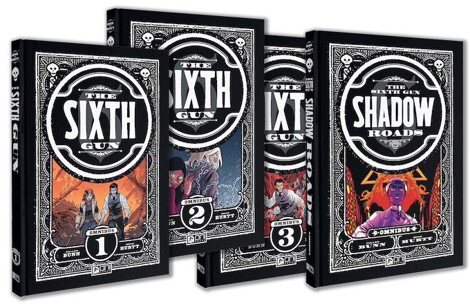 Featuring the entirety of the series’ groundbreaking, 50-issue run from THE SIXTH GUN #1–50 – plus the companion THE SIXTH GUN: SONS OF THE GUN #1-5, THE SIXTH GUN: DAYS OF THE DEAD #1-5, THE SIXTH GUN: DUST TO DUST #1-3, and THE SIXTH GUN: VALLEY OF DEATH #1-3 series, alongside the standalone spin-off series, SHADOW ROADS #1-10 – across four hardcover volumes spanning more than 1,500 pages, THE SIXTH GUN DELUXE OMNIBUS LIBRARY is the ultimate opportunity to experience Bunn and Hurtt’s occult odyssey through the Old West for long-time fans and first-time readers alike.
