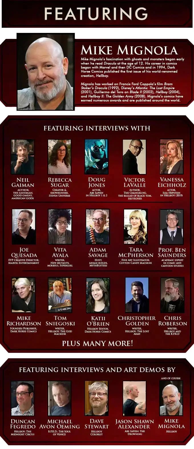 The documentary features Mythbusters host Adam Savage, Hellboy film actor Doug Jones and actress Vanessa Eichhotlz, novelists Christopher Golden (of the bestselling Ben Walker novels) and Victor LaValle (The Ballad Of Black Tom), Dark Horse Publisher and founder Mike Richardson, Dark Horse Editor Katii O’Brien, Marvel EVP of Creative Development Joe Quesada, comic book writers Vita Ayala (The Wilds), Chris Roberson (Hellboy & The B.P.R.D.) and Thomas Sniegoski (Young Hellboy), and award-winning cartoonist Fábio Moon (Daytripper), as well as interviews and art demonstrations with painter Jason Shawn Alexander, Duncan Fegredo (Hellboy: The Wild Hunt), Michael Avon Oeming (B.P.R.D.: The Soul Of Venice), award-winning colorist Dave Stewart and, of course, Mignola himself.