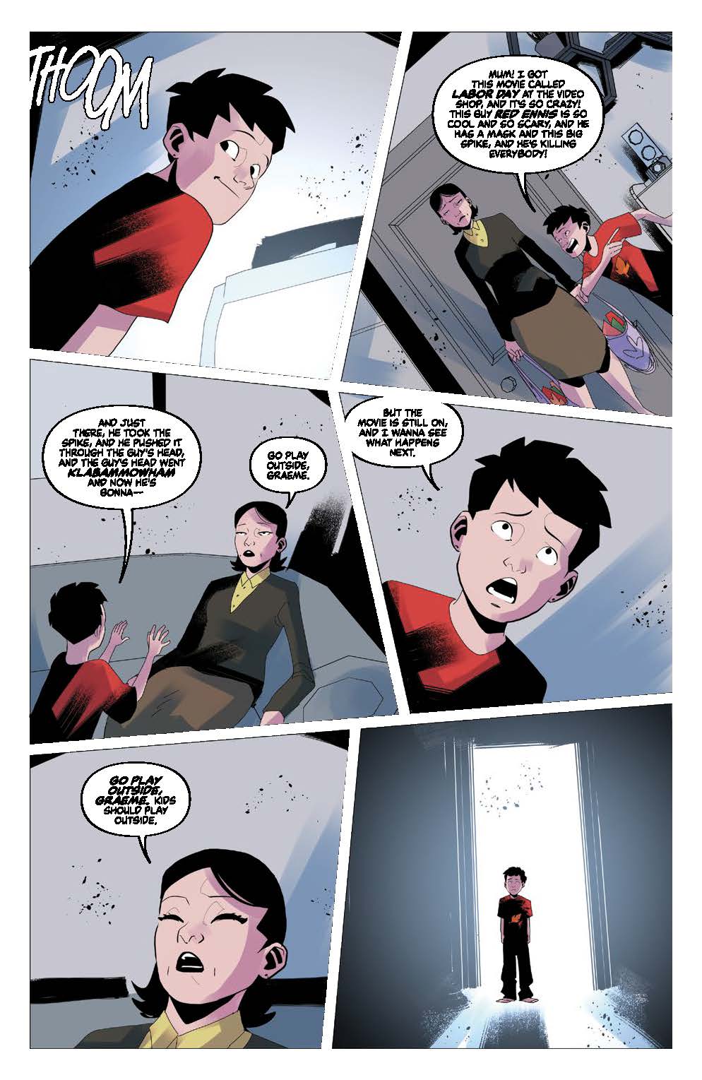 In The Nasty, the main character Graeme is a member of a group called The Murder Club that watches a wide variety of “video nasties.” Adam, how fun was it for you to illustrate all of these different movies within the main story? Did you set out to give each film its own unique style while still interweaving it with the look of the overall story?