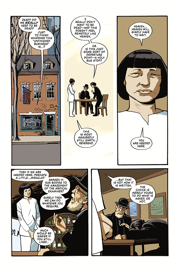 On the brink of the afterlife, a deceased trio consisting of a priest, a rabbi, and a minister must work together to figure out why they're still on Earth and what they need to accomplish before the next phase in their spiritual journeys can begin in the new graphic novel Unfinished Business.
