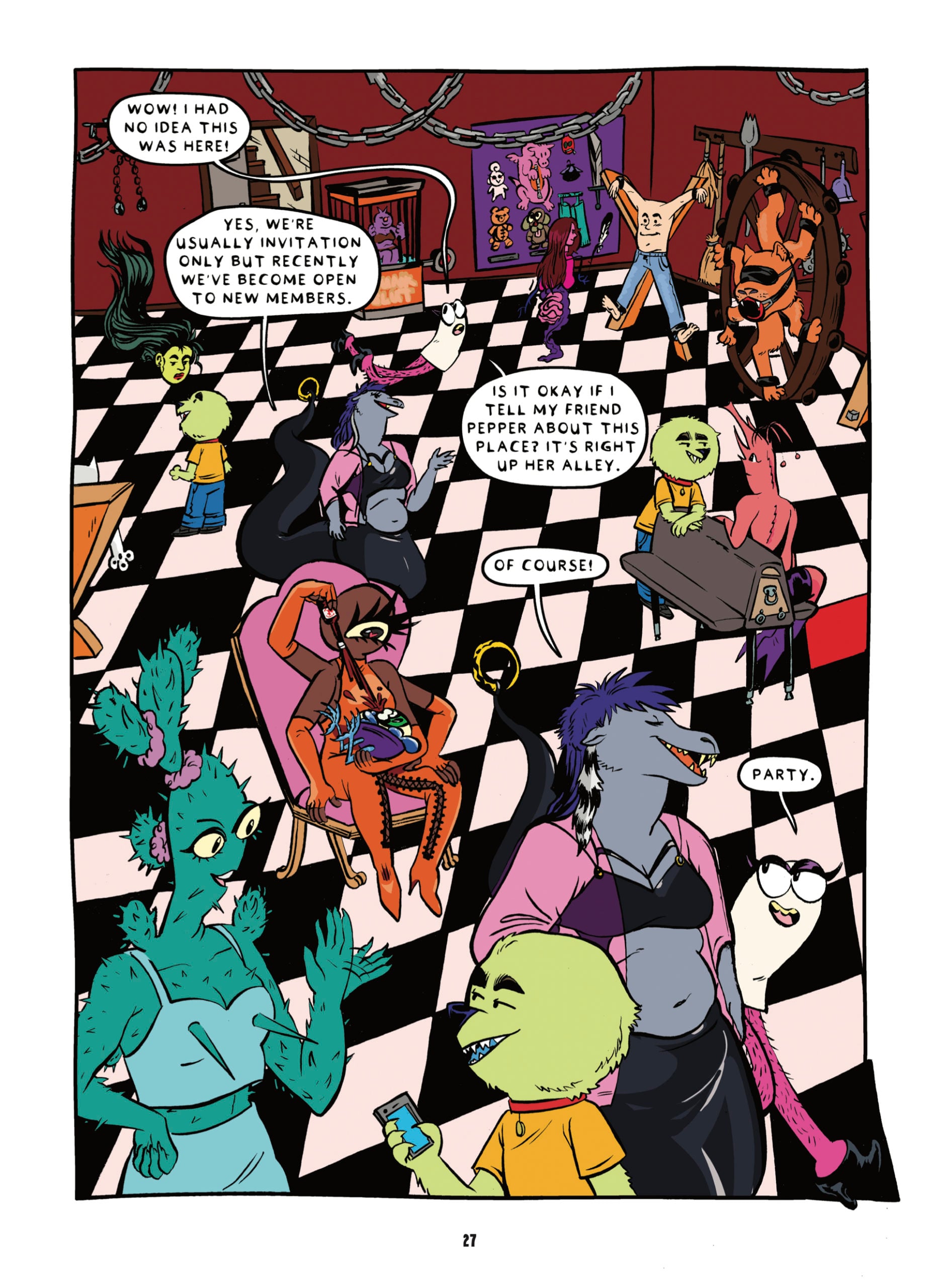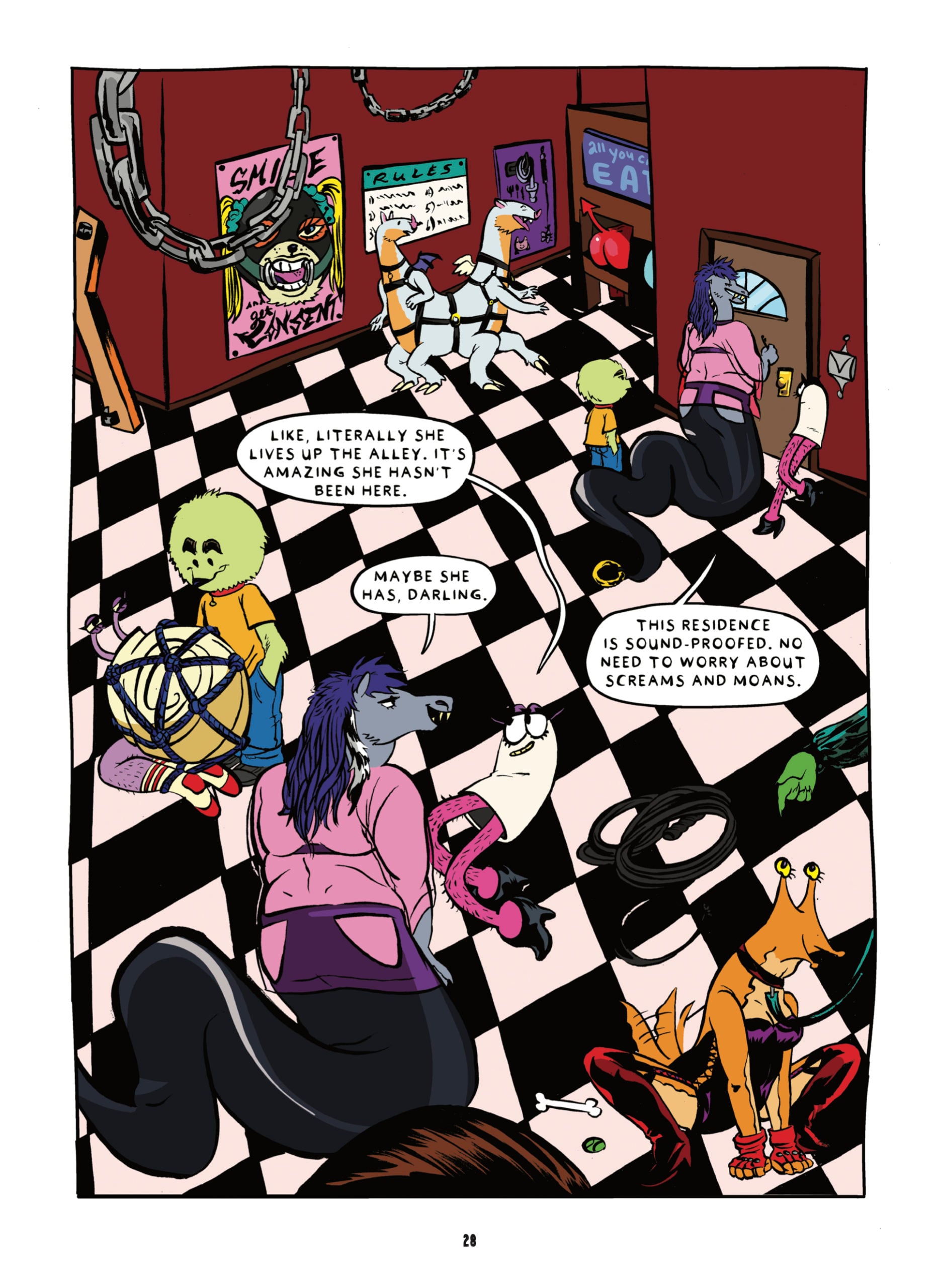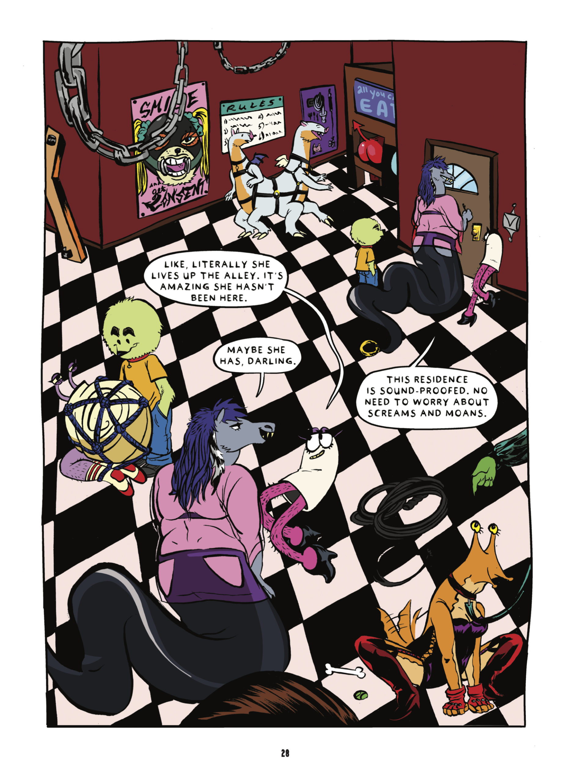 "In WINE GHOST GOES TO HELL, the form you are given after death fits the punishment for your life. If an overall bad person loved to run but was scared of water, they’d be a mermaid in the afterlife. Working with that idea in mind allows me to get really weird with character designs on something as simple as a dominatrix in the background."