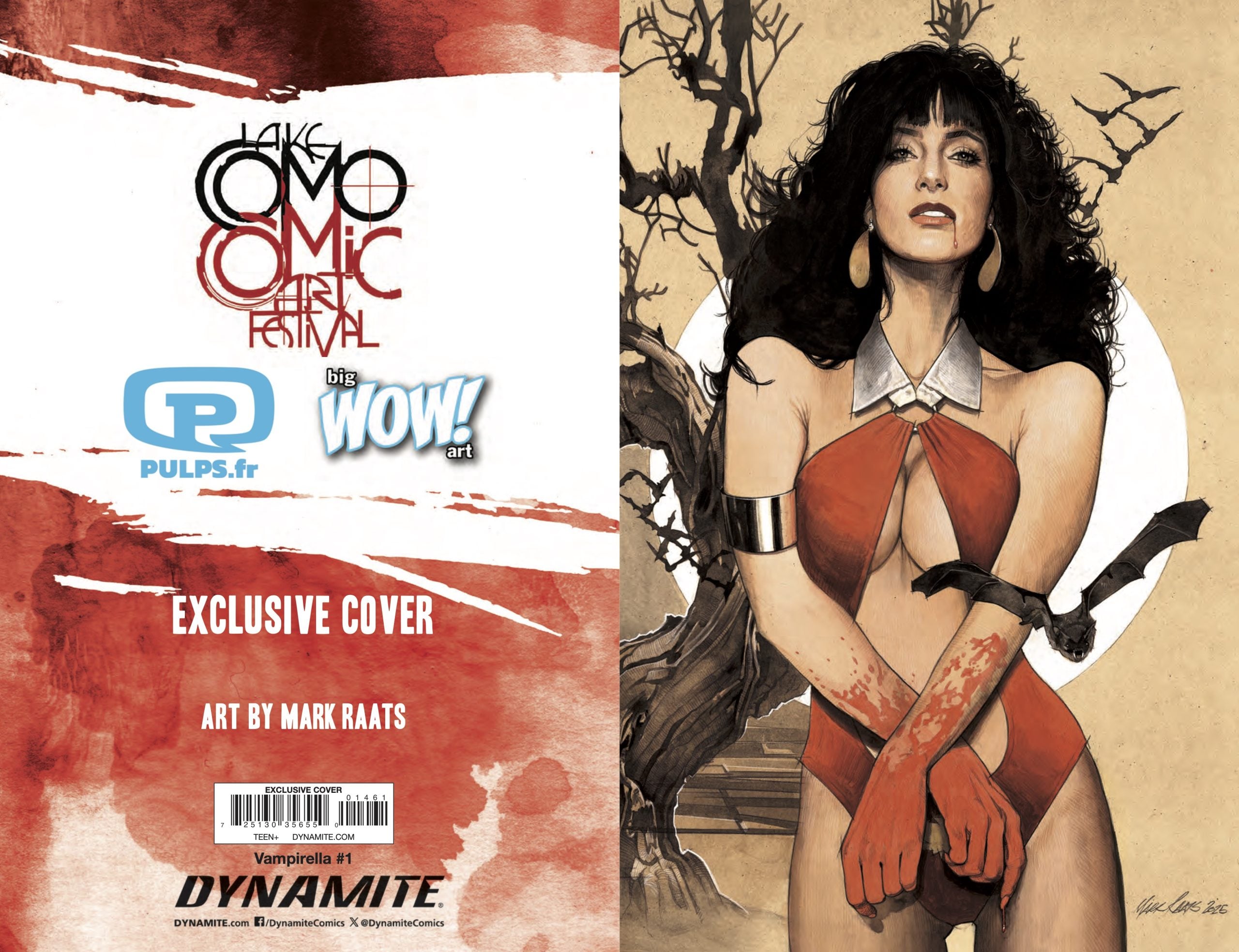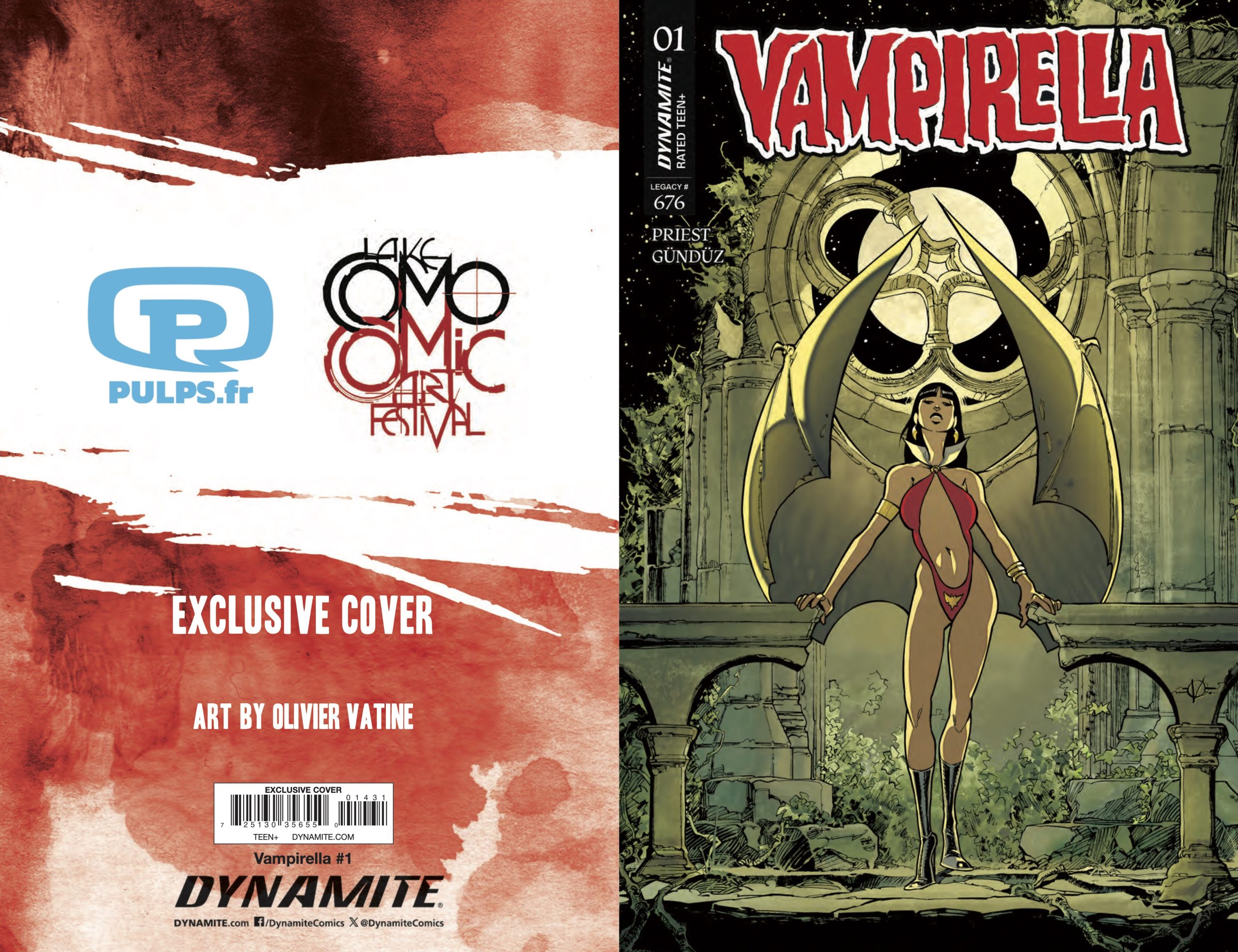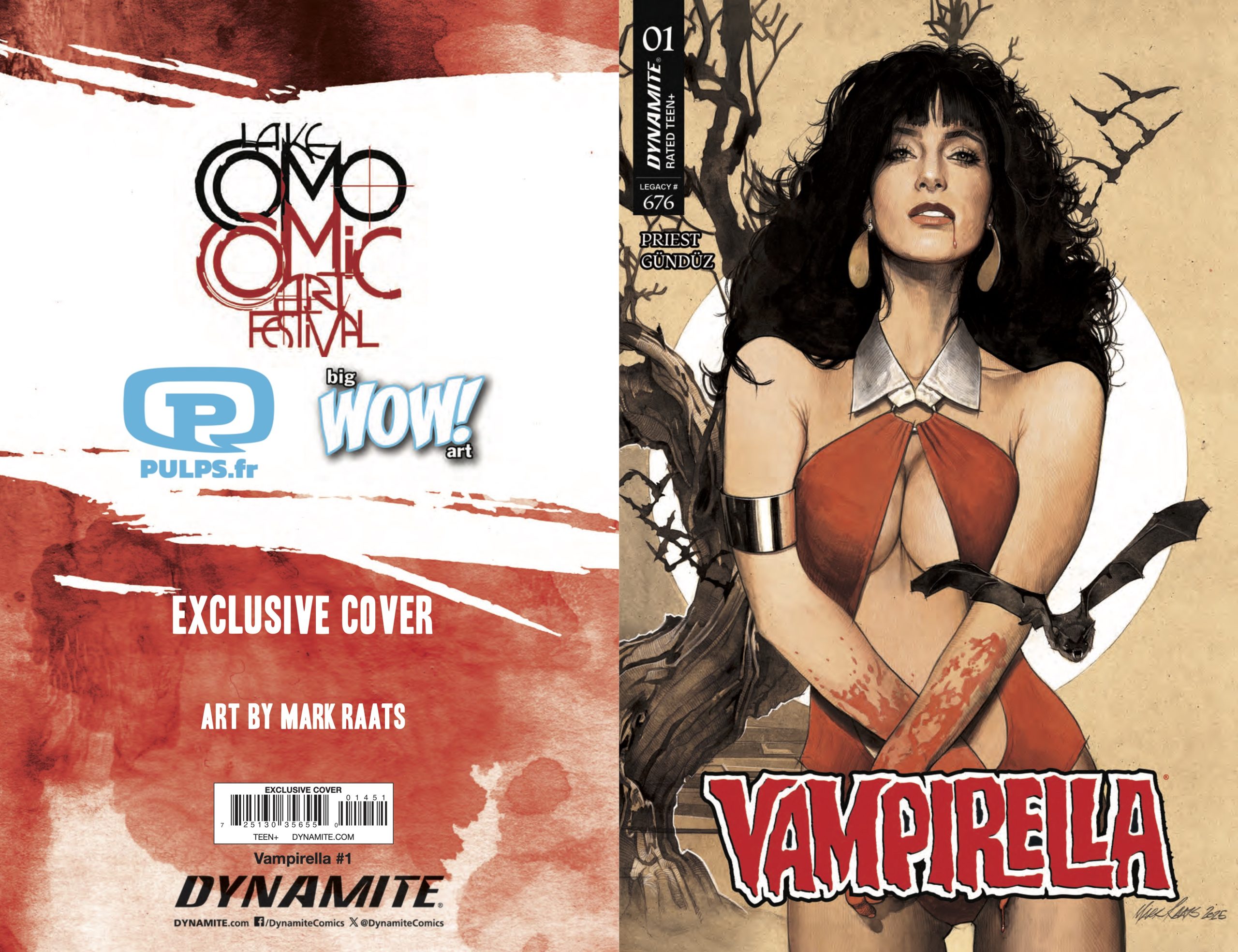 In March, Dynamite Entertainment relaunched the iconic Vampirella with a new comic book series from writer Christopher Priest and artist Ergün Gündüz. The Lake Como Comic Art Festival will have three Vampirella #1 variants by festival guests Mark Raats, Olivier Vatine, and Yannick Corboz available at the event, and we have your exclusive look at all three covers.