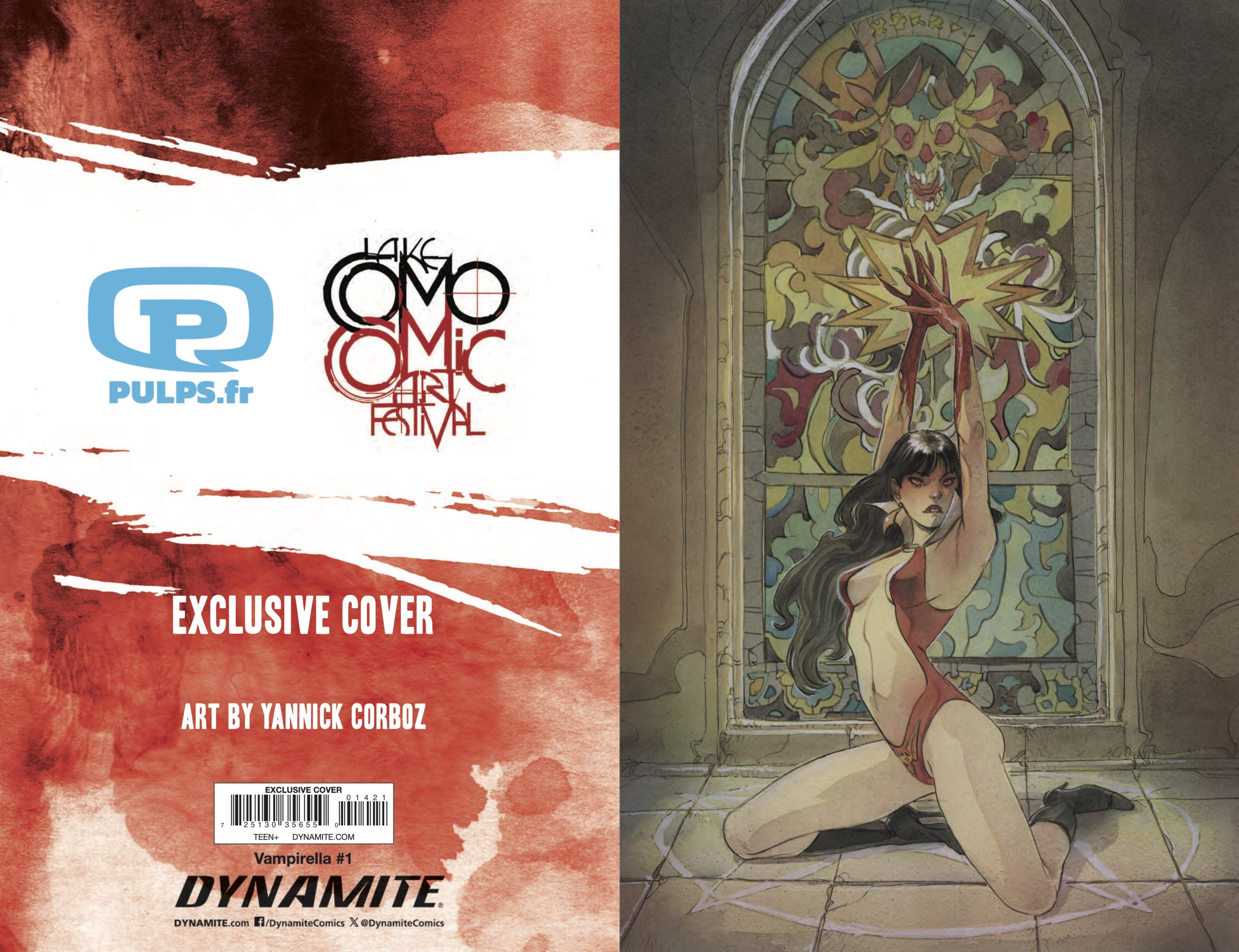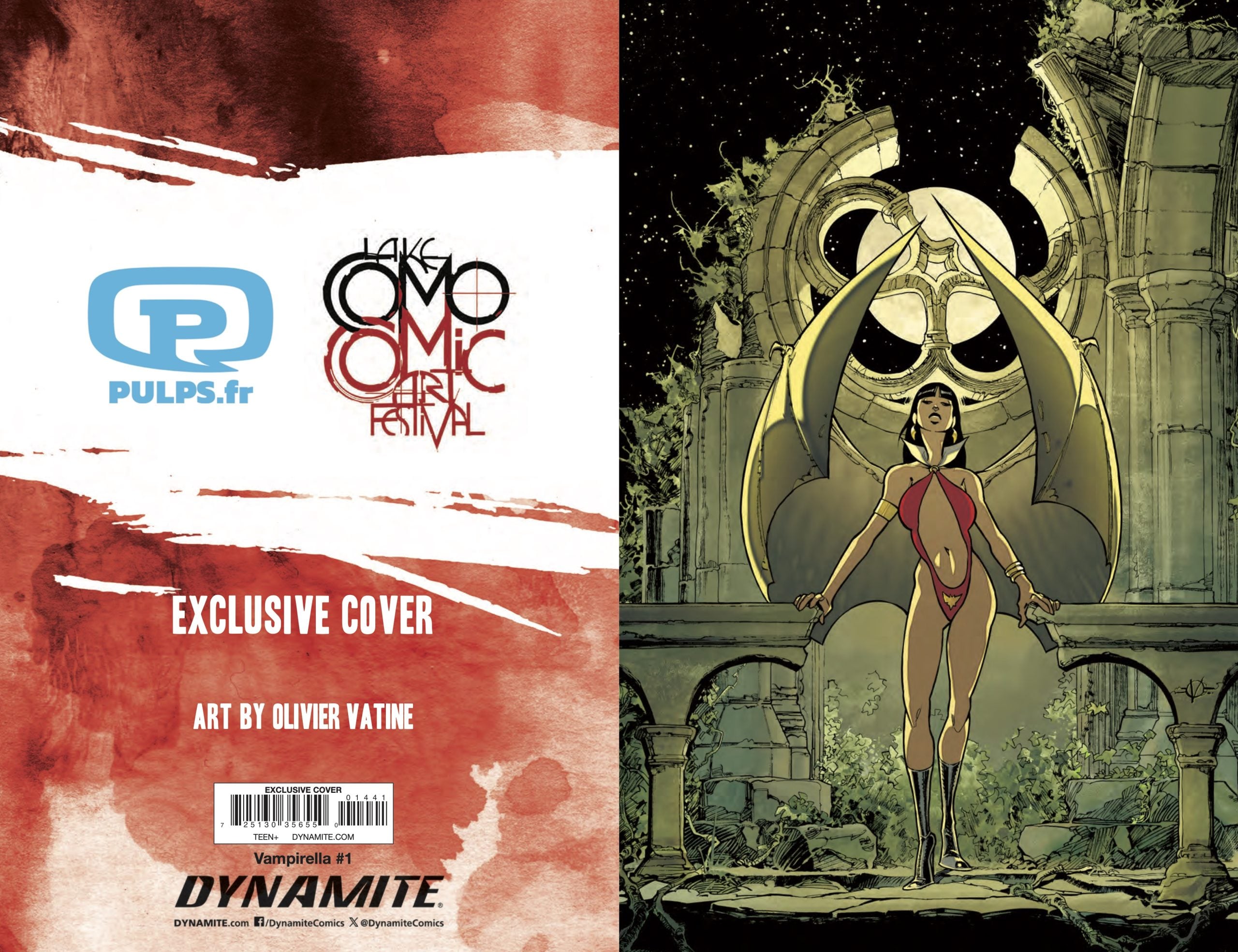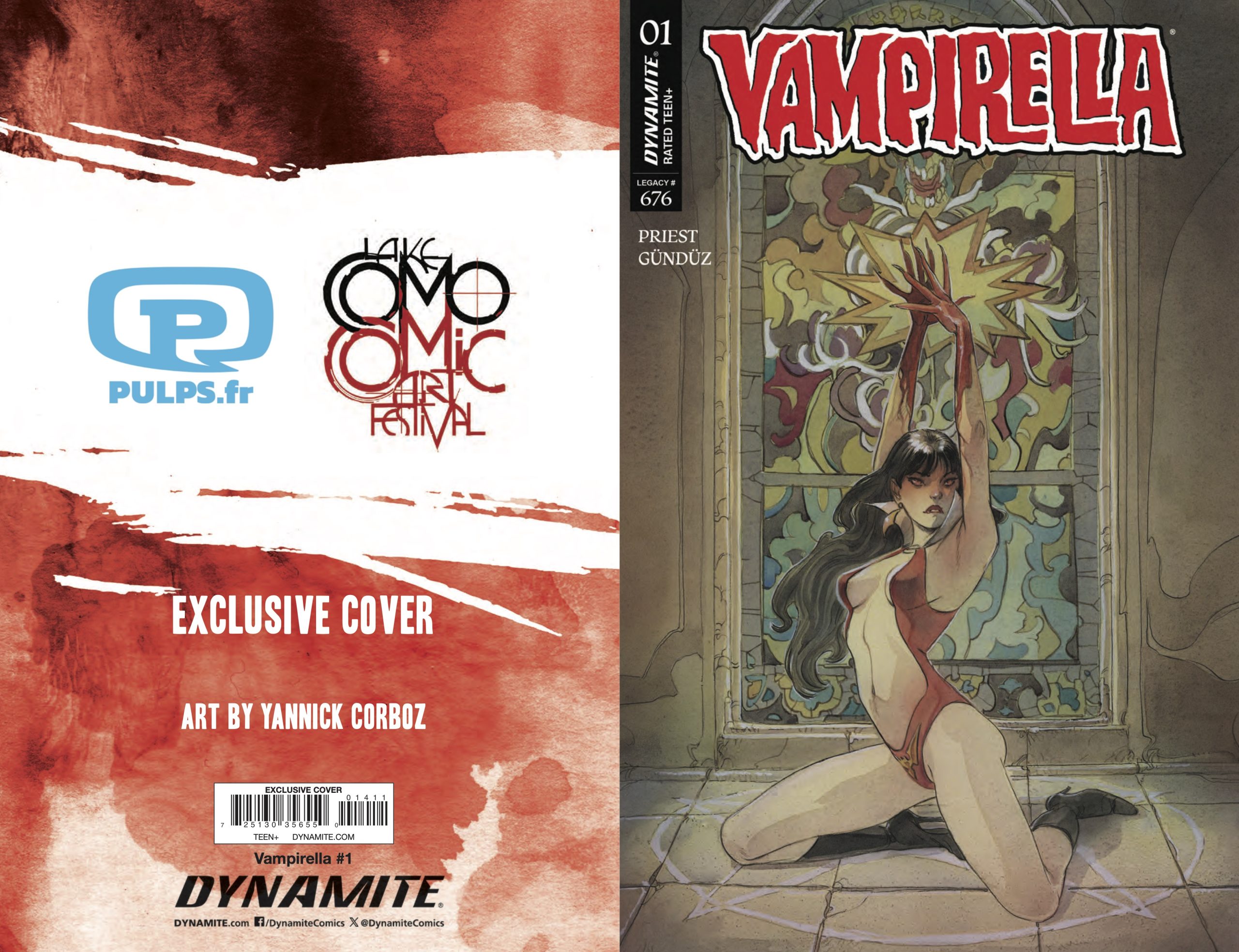 In March, Dynamite Entertainment relaunched the iconic Vampirella with a new comic book series from writer Christopher Priest and artist Ergün Gündüz. The Lake Como Comic Art Festival will have three Vampirella #1 variants by festival guests Mark Raats, Olivier Vatine, and Yannick Corboz available at the event, and we have your exclusive look at all three covers.