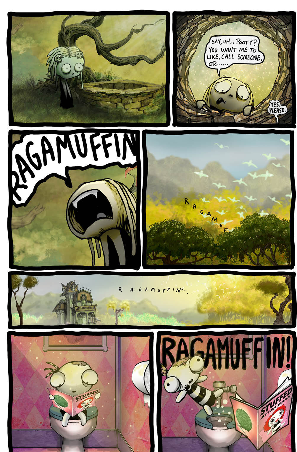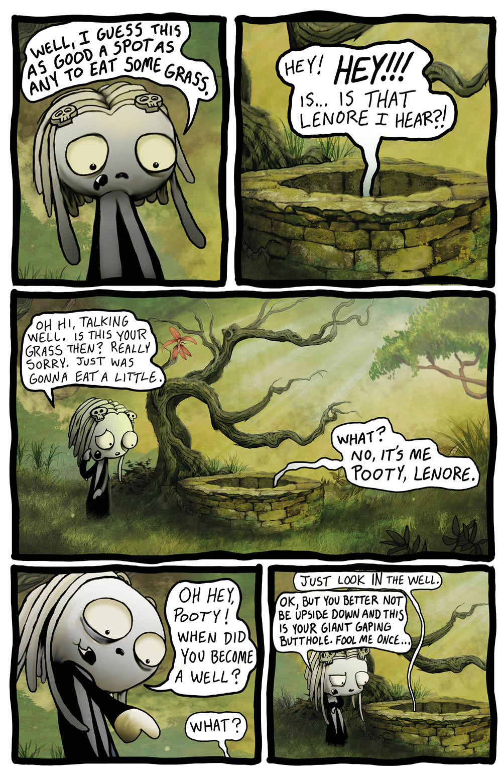 One day in the deep dark forest, whilst out on a lovely walk, looking for some green grass to eat, Lenore and Ragamuffin find their chum Pooty at the bottom of a reeaally deep dark well.