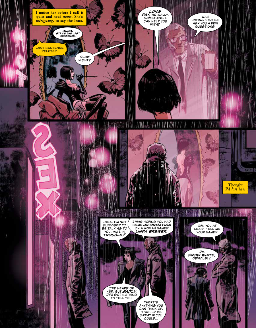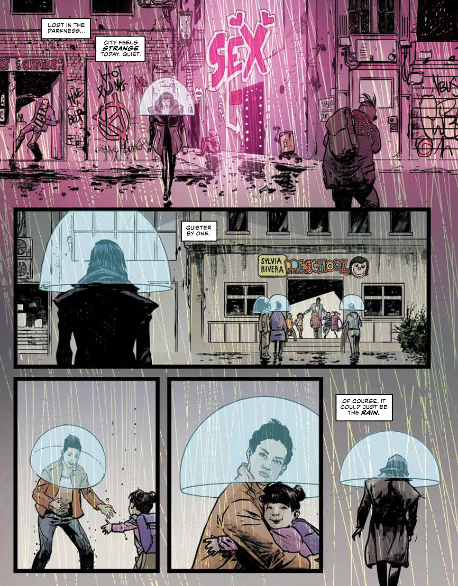 Vin is an escort working in the “Blacklight District” of future NYC, a place where people’s wildest fantasies can be sought out. Being a victim of a past societal trauma, one shared by many people still living there, she’s a survivor and fiercely independent despite being fetishized for her differences. She’s the perfect hero for me: strong, self-assured, and, in moments, open about her vulnerabilities.