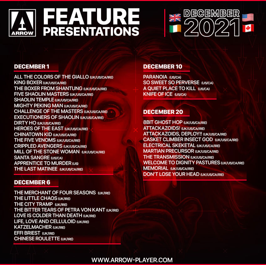 December 1 will see the arrival of The Last Matinee (UK/US/CA/IRE), Santa Sangre (US/CA), All the Colors of the Giallo (UK/US/CA/IRE), King Boxer (UK/US/CA/IRE), The Boxer from Shantung (UK/US/CA/IRE), Five Shaolin Masters (UK/US/CA/IRE), Shaolin Temple (UK/US/CA/IRE), Mighty Peking Man (UK/US/CA/IRE), Challenge of the Masters (UK/US/CA/IRE), Executioners of Shaolin (UK/US/CA/IRE), Dirty Ho (UK/US/CA/IRE), Heroes of the East (UK/US/CA/IRE), Chinatown Kid (UK/US/CA/IRE), The Five Venoms (UK/US/CA/IRE), Crippled Avengers (UK/US/CA/IRE), Apprentice to Murder (US), and Mill of the Stone Women (UK/US/CA/IRE).