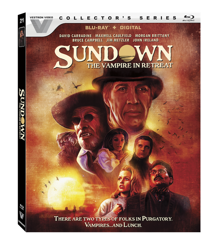 A new edition to the Vestron Video Collector’s Series, the tongue-in-cheek vampire film Sundown: The Vampire in Retreat arrives on Blu-ray™ (plus Digital) August 17 from Lionsgate. Sundown: The Vampire in Retreat stars Golden Globe® nominee David Carradine (2005, Best Supporting Role – Motion Picture, Kill Bill: Vol.2), Maxwell Caulfield (Grease 2, “The Colbys, A Prince for Christmas), Morgan Brittany (GypsyGable and Lombard, TV’s “Dallas”), Bruce Campbell (The Evil Dead, Evil Dead 2Army of Darkness, TV’s “Ash vs Evil Dead”), and Golden Globe® nominee Jim Metzler (1983, Best Supporting Role – Motion Picture, Tex). Sundown: The Vampire in Retreat will be available on Blu-ray™ (plus Digital) for the suggested retail price of $17.99.
